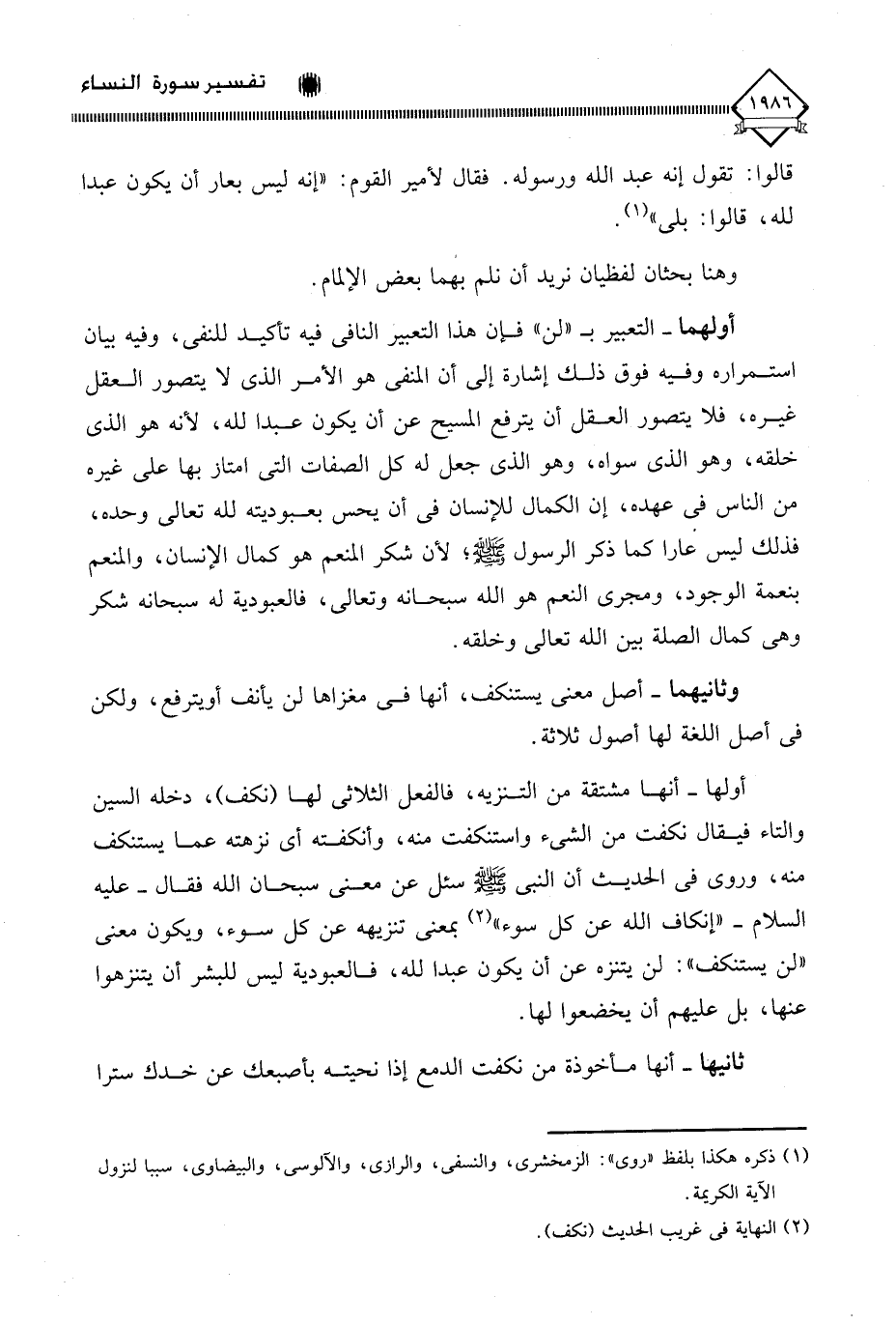 أولها - أنها مشتقة من التنزيه، فالفعل الثلاثى لها (نكف)، دخله السين والتاء فيقال نكفت من الشيء واستنكفت منه، وأنكفته أي نزهته عما يستنكف منه، وروى في الحديث أن النبي - صلى الله عليه وسلم - سئل عن معنى سبحان الله فقال - عليه السلام - " إنكاف الله عن كل سوء " (¬2) بمعنى تنزيهه عن كل سوء، ويكون معنى " لن يستنكف ": لن يتنزه عن أن يكون عبدا لله، فالعبودية ليس للبشر أن يتنزهوا عنها، بل عليهم أن يخضعوا لها.