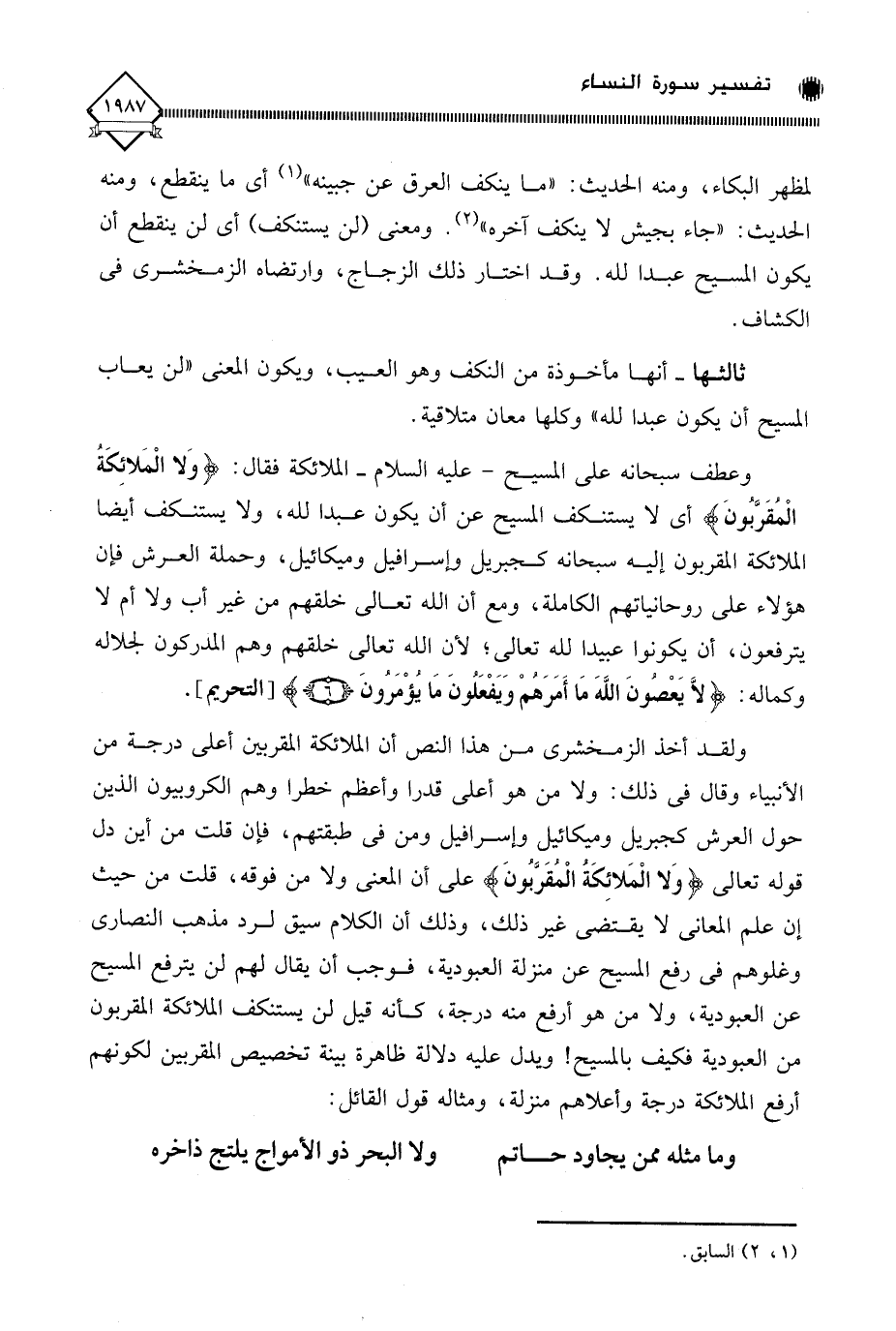 تالثها - أنها مأخوذة من النكف وهو العيب، ويكون المعنى " لن يعاب المسيح أن يكون عبدا لله " وكلها معان متلاقية.