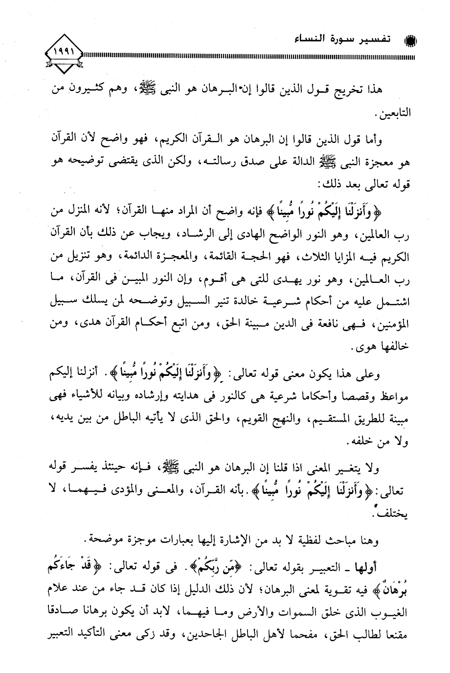ولا يتغير المعنى اذا قلنا إن البرهان هو النبي - صلى الله عليه وسلم -، فإنه حينئذٍ يفسر قوله تعالى: (وَأَنْزَلْنَا إِلَيْكُمْ نُورًا مُبِينًا). بأنه القرآن، والمعنى والمؤدى فيهما، لا يختلف.