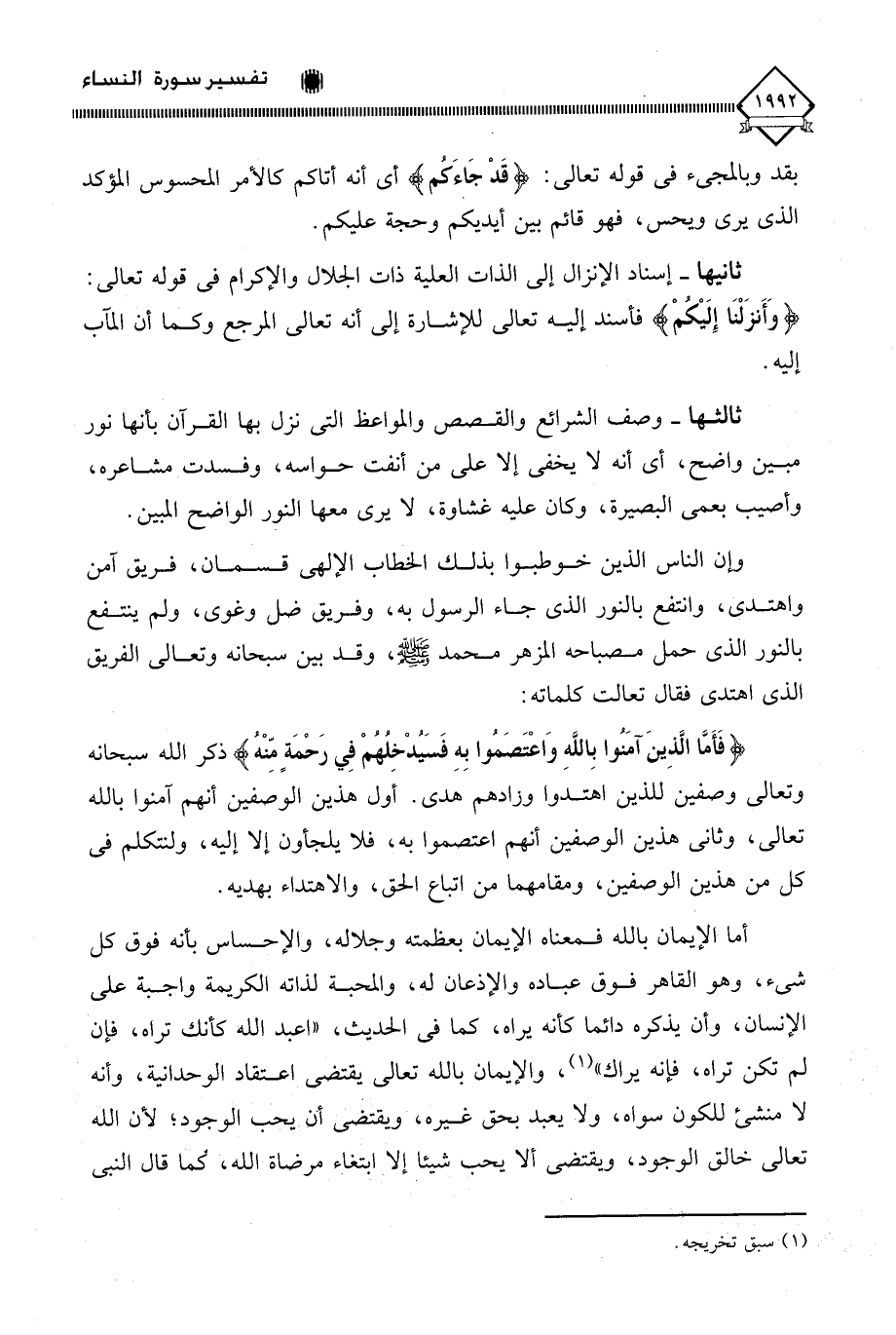 ذكر الله سبحانه وتعالى وصفين للذين اهتدوا وزادهم هدى. أول هذين الوصفين أنهم آمنوا بالله تعالى، وثاني هذين الوصفين أنهم اعتصموا به، فلا يلجأون إلا إليه، ولنتكلم في كل من هذين الوصفين، ومقامهما من اتباع الحق، والاهتداء بهديه.