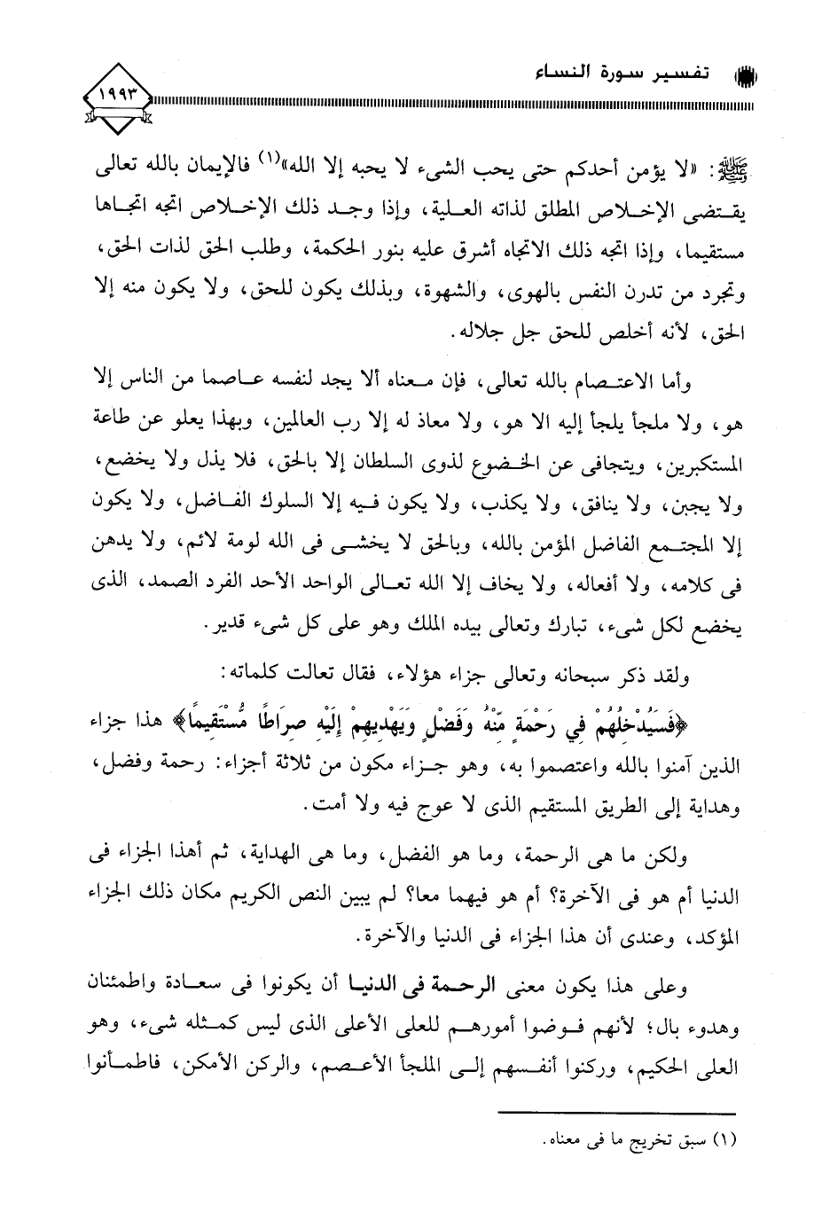 (فَسَيُدْخِلُهُمْ فِي رَحْمَةٍ منْهُ وَفَضْلٍ وَيَهْدِيهِمْ إِلَيْهِ صِرَاطًا مُّسْتَقِيمًا) هذا جزاء الذين آمنوا بالله واعتصموا به، وهو جزاء مكون من ثلاثة أجزاء: رحمة وفضل، وهداية إلى الطريق المستقيم الذي لَا عوج فيه ولا أمت.
