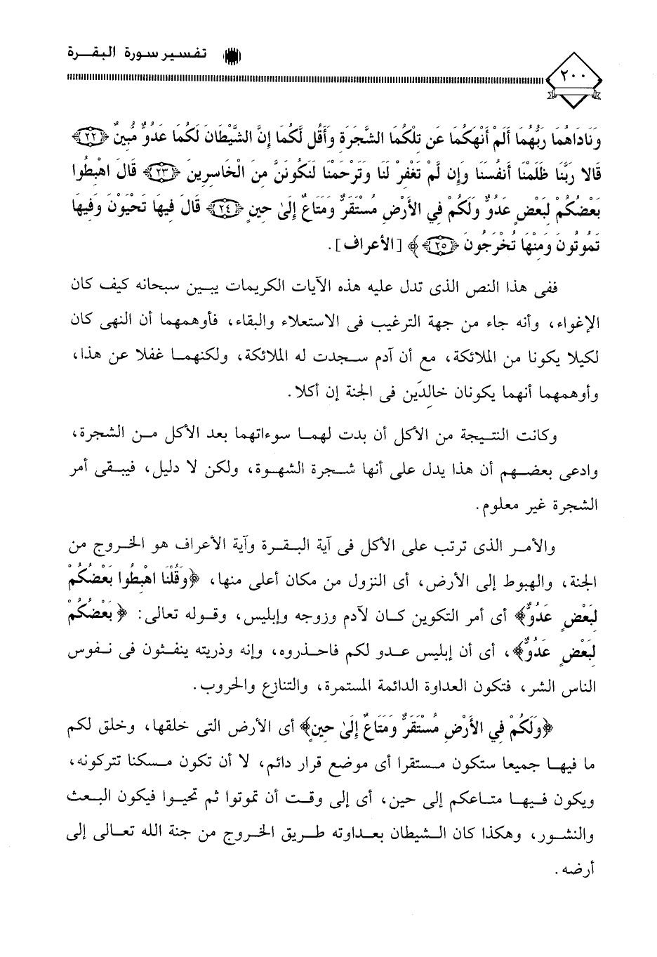 والأمر الذي ترتب على الأكل في آية البقرة وآية الأعواف هو الخروج من الجنة، والهبوط إلى الأرض، أي النزول من مكان أعلى منها، (وَقلنَا اهْبِطُوا بَعْضُكُمْ لِبَعْضٍ عَدُوٌّ) أى أمر التكوين كان لآدم وزوجه وإبليس، وقوله تعالى: (بَعْضُكُمْ لِبَعْضٍ عَدُوٌّ)، أي أن إبليس عدو لكم فاحذروه، وإنه وذريته ينفثون في نفوس الناس الشر، فتكون العداوة الدائمة المستمرة، والتنازع والحروب.