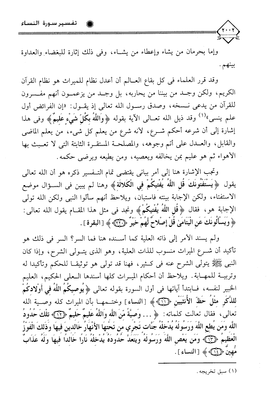 ولم يسند الأمر إلى ذاته العلية كما أسنده هنا فما السر؟ السر في ذلك هو تأكيد أن شرع الميراث منسوب للذات العلية، وهو الذي يتولى الشرح، وإذا كان النبي - صلى الله عليه وسلم - يتولى الشرح عنه في كثير، فهنا قد تولى هو توثيقا للحكم وتأكيدا له وتربية للمهابة. ويلاحظ أن أحكام الميراث كلها أسندها العلي الحكيم، العليم الخبير لنفسه، فابتدأ آياتها في أول السورة بقوله تعالى (يُوصِيكُمُ اللَّهُ فِي أَوْلادِكُمْ لِلذَّكَرِ مثْلُ حَظّ الأنثَيَيْنِ)، وختمها بأن الميراث كله وصية الله تعالى، َ فقال تعَالت كلماته: (. . . وَصِيَّةً مِنَ اللَّهِ وَاللَّهُ عَلِيمٌ حَلِيمٌ (12) تِلْكَ حُدُودُ اللَّهِ وَمَنْ يُطِعِ اللَّهَ وَرَسُولَهُ يُدْخِلْهُ جَنَّاتٍ تَجْرِي مِنْ تَحْتِهَا الْأَنْهَارُ خَالِدِينَ فِيهَا وَذَلِكَ الْفَوْزُ الْعَظِيمُ (13) وَمَنْ يَعْصِ اللَّهَ وَرَسُولَهُ وَيَتَعَدَّ حُدُودَهُ يُدْخِلْهُ نَارًا خَالِدًا فِيهَا وَلَهُ عَذَابٌ مُهِينٌ (14).