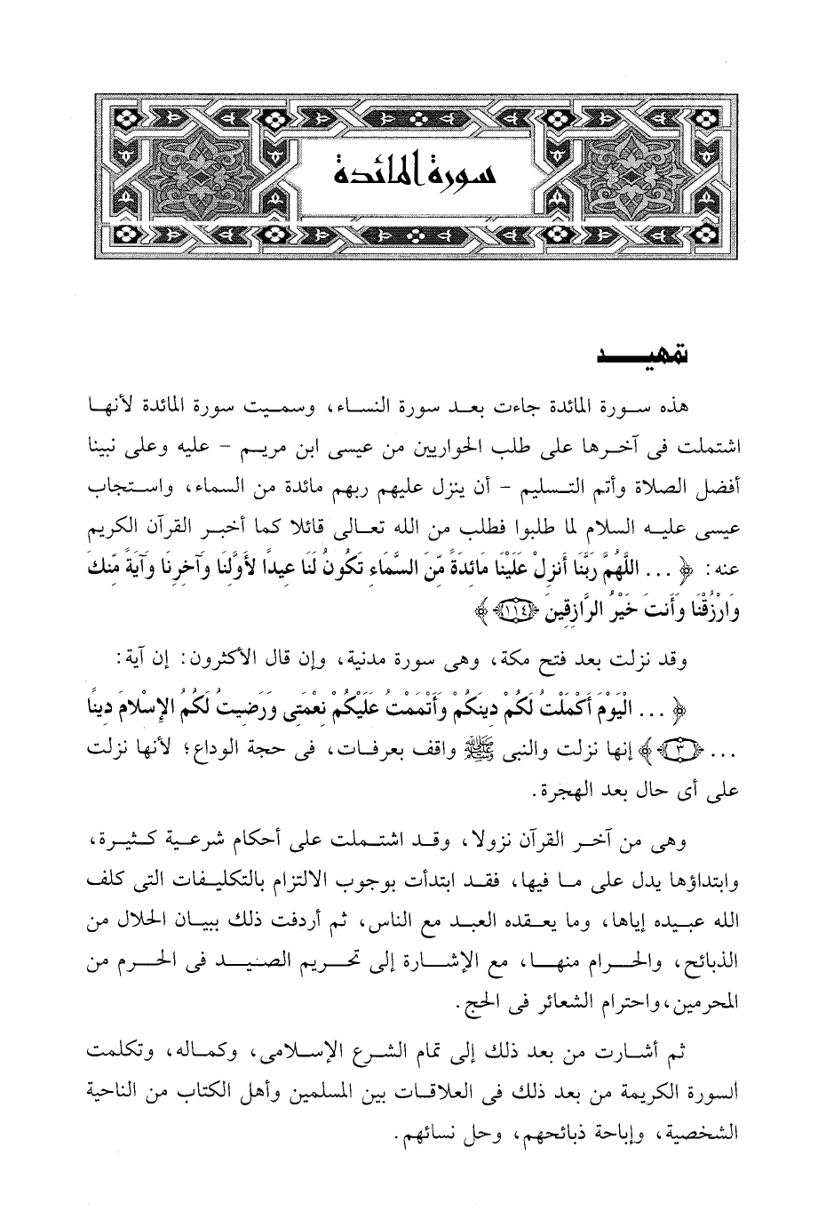 هذه سورة المائدة جاءت بعد سورة النساء، وسميت سورة المائدة لأنها اشتملت في آخرها على طلب الحواريين من عيسى ابن مريم - عليه وعلى نبينا أفضل الصلاة وأتم التسليم - أن ينزل عليهم ربهم مائدة من السماء، واستجاب عيسى عليه السلام لما طلبوا فطلب من الله تعالى قائلا كما أخبر القرآن الكريم عنه: (. . . اللَّهُمَّ رَبَّنَا أَنزِلْ عَلَيْنَا مَائدَةً مِّنَ السَّمَاءِ تَكُونُ لَنَا عيدًا لأَوَّلِنَا وَآخِرِنَا وَآيَةً مِّنكَ وَارْزُقْنَا وَأَنتَ خَيْرُ الرَّازِقِينَ).