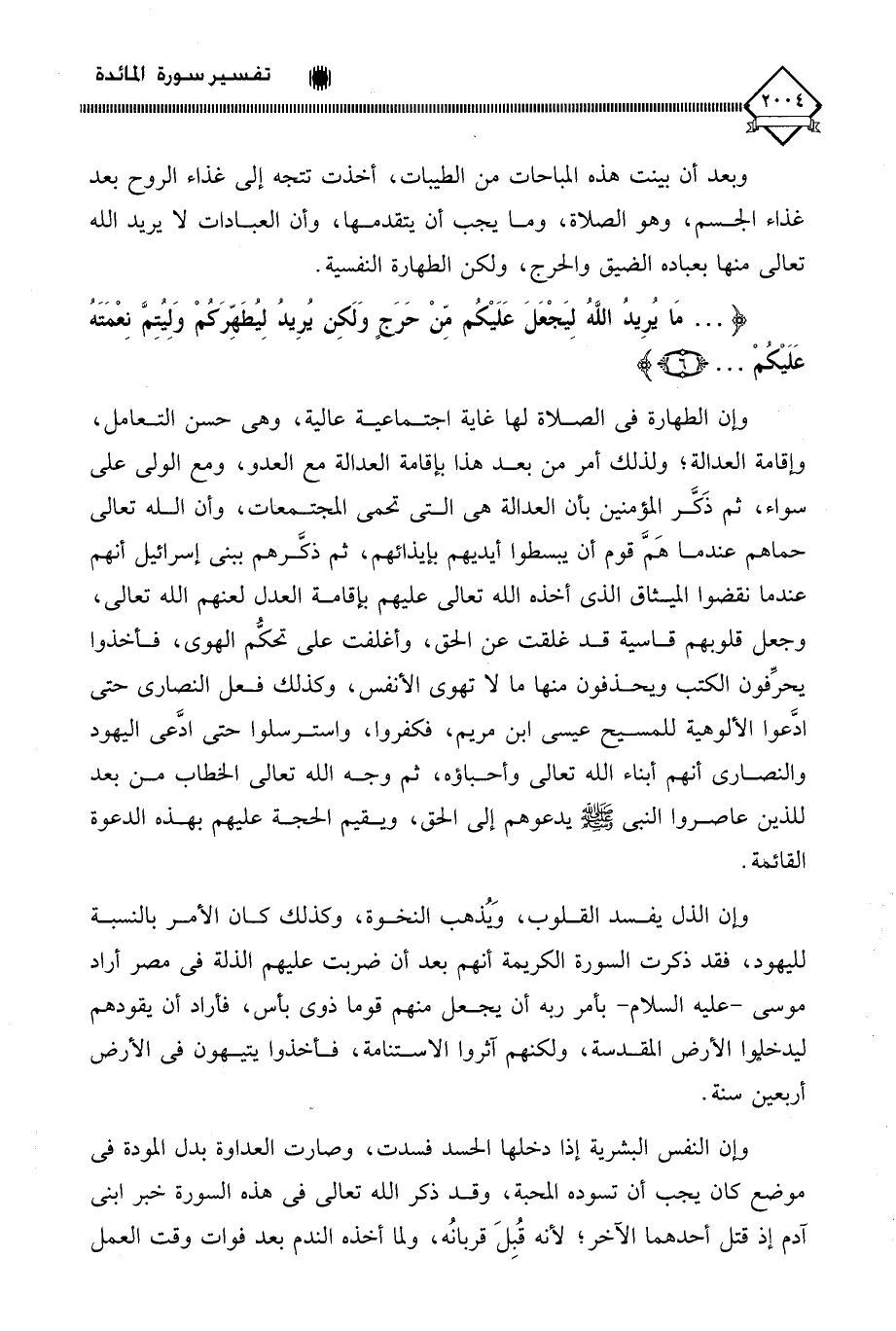 وإن الطهارة في الصلاة لها غاية اجتماعية عالية، وهي حسن التعامل، وإقامة العدالة، ولذلك أمر من بعد هذا بإقامة العدالة مع العدو، ومع الولي على سواء، ثم ذَكَّر المؤمنين بأن العدالة هي التي تحمي المجتمعات، وأن الله تعالى حماهم عندما هَمَّ قوم أن يبسطوا أيديهم بإيذائهم، ثم ذكَّرهم ببني إسرائيل أنهم عندما نقضوا الميثاق الذي أخذه الله تعالى عليهم بإقامة العدل لعنهم الله تعالى، وجعل قلوبهم قاسية قد غلقت عن الحق، وأغلفت على تحكُّم الهوى، فأخذوا يحرِّفون الكتب ويحذفون منها ما لَا تهوى الأنفس، وكذلك فعل النصارى حتى ادَّعوا الألوهية للمسيح عيسى ابن مريم، فكفروا، واسترسلوا حتى ادَّعى اليهود والنصارى أنهم أبناء الله تعالى وأحباؤه، ثم وجه الله تعالى الخطاب من بعد للذين عاصروا النبي - صلى الله عليه وسلم - يدعوهم إلى الحق، ويقيم الحجة عليهم بهذه الدعوة القائمة.