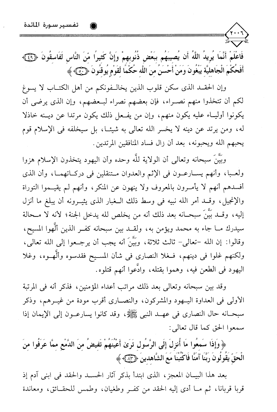 وبَيَّنَ سبحانه وتعالى أن الولاية للَّه وحده وأن اليهود يتخذون الإسلام هزوا ولعبا، وأنهم يسارعون في الإثم والعدوان متنقلين في دركاتهما، وأن الذي أفسدهم أنهم لَا يأمرون بالمعروف ولا ينهون عن المنكر، وأنهم لم يقيموا التوراة والإنجيل، وقد أمر الله نبيه في وسط ذلك الغبار الذي يثيرونه أن يبلغ ما أنزل إليه، وقد بَيَّنَ سبحانه بعد ذلك أنه من يخلص لله يدخل الجنة؛ لأنه لَا محالة سيدرك ما جاء به محمد ويؤمن به، ولقد بين سبحانه كفر الذين ألَّهوا المسيح، وقالوا: إن الله - تعالى - ثالث ثلاثة، وبَيَّنَ أنه يجب أن يرجعوا إلى الله تعالى، ولكنهم غلوا في دينهم، فغلا النصارى في شأن المسيح فقدسوه وألَّهوه، وغلا اليهود في الطعن فيه، وهموا بقتله، وادَّعوا أنهم قتلوه.