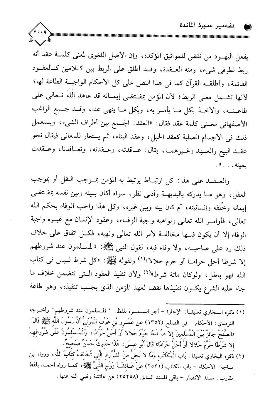 والعقد على هذا: كل ارتباط يرتبط به المؤمن بموجب النقل أو بموجب العقل، وهو ما يدركه بالبديهة وأدنى نظر، سواء أكان بينه وبين نفسه بمقتضى إيمانه وخُلقه وإنسانيته، أم كان بينه وبين غيره، وكل هذا واجب الوفاء بحكم الله تعالى، فأوامر الله تعالى ونواهيه واجبة الوفاء، وعقود الإنسان مع غيره واجبة الوفاء إلا أن يكون فيها مخالفة لأمر الله تعالى ونهيه، فكل اتفاق على خلاف ذلك رد على صاحبه، ولا وفاء فيه، لقول النبي - صلى الله عليه وسلم -: " المسلمون عند شروطهم إلا شرطا أحل حراما أو حرم حلالا " (¬1) ولقوله - صلى الله عليه وسلم -: " كل شرط ليس في كتاب الله فهو باطل، ولوكان مائة شرط " (¬2) ولأن تنفيذ العقود التي تتضمن خلاف ما جاء عليه الشرع يكون تنفيذها نقضا لعهد المؤمن الذي يجب تنفيذه، وهو طاعة