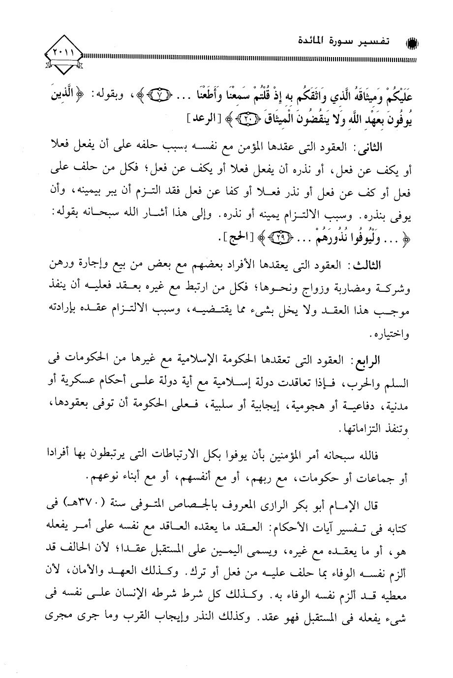 قال الإمام أبو بكر الرازي المعروف بالجصاص المتوفى سنة (370 هـ) في كتابه في تفسير آيات الاحكام: العقد ما يعقده العاقد مع نفسه على أمر يفعله هو، أو ما يعقده مع غيره، ويسمى اليمين على المستقبل عقدا، لأن الحالف قد ألزم نفسه الوفاء بما حلف عليه من فعل أو ترك. وكذلك العهد والأمان، لأن معطيه قد ألزم نفسه الوفاء به. وكذلك كل شرط شرطه الإنسان على نفسه في شيء يفعله في المستقبل فهو عقد. وكذلك النذر وإيجاب القرب وما جرى مجرى