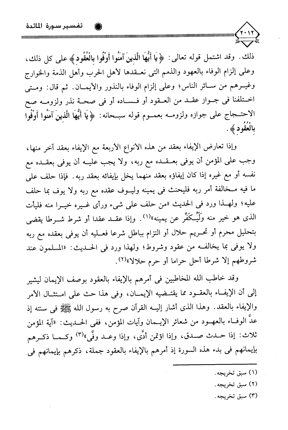 وقد خاطب الله المخاطبين في أمرهم بالإيفاء بالعقود بوصف الإيمان ليشير إلى أن الإيفاء بالعقود مما يقتضيه الإيمان، وفي هذا حث على امتثال الأمر والإيفاء بالعقد. وهذا الذي أشار إليه القرآن صرح به رسول الله - صلى الله عليه وسلم - في سنته إذ عدَّ الوفاء بالعهود من شعائر الإيمان وآيات المؤمن، ففي الحديث: " آية المؤمن ثلاث: إذا حدث صدق، وإذا اؤتمن أدَّى، وإذا وعد وفَّى " (¬3) وكما ذكرهم بإيمانهم في بدء هذه السورة إذ أمرهم بالإيفاء بالعقود جملة، ذكرهم بإيمانهم في