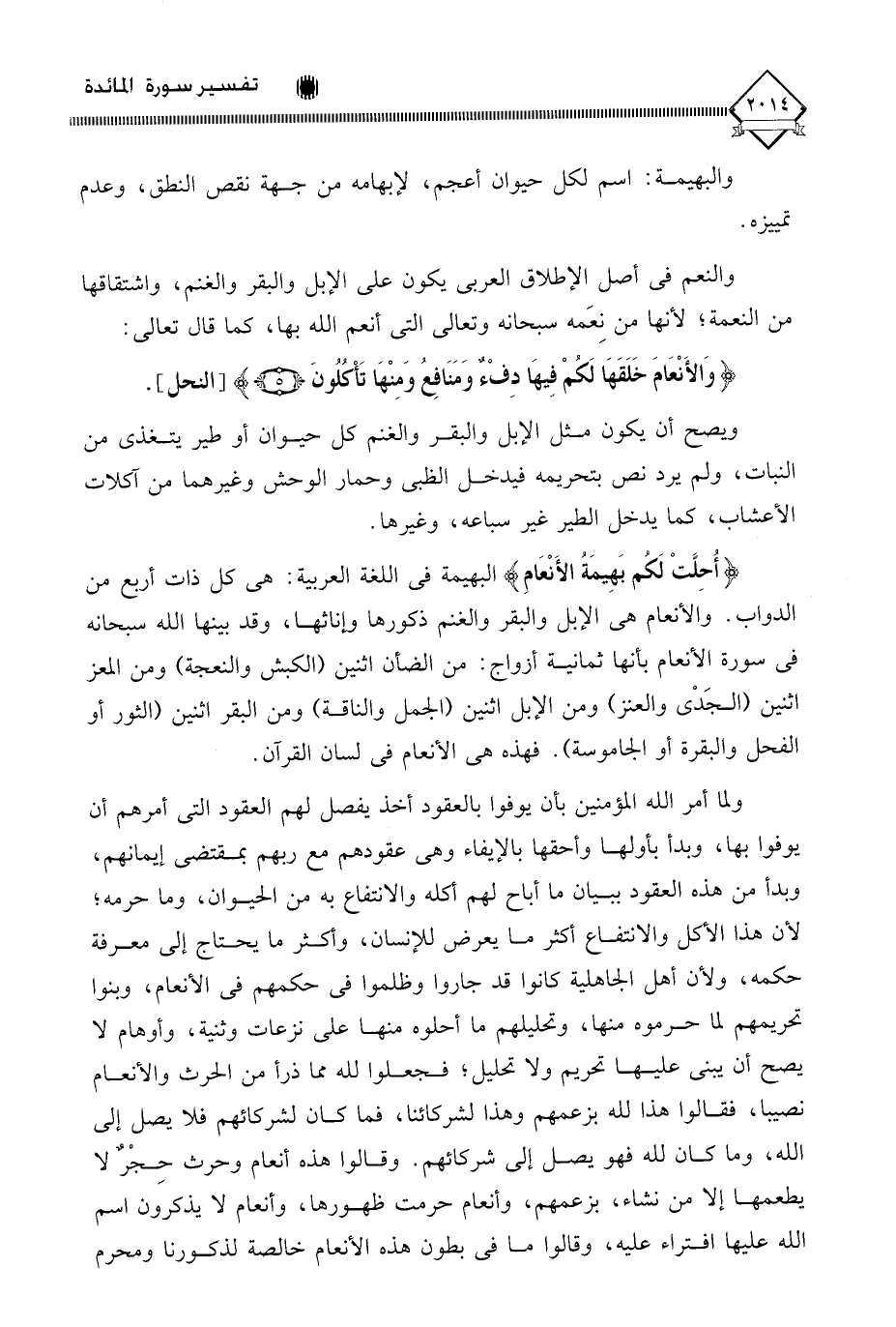 (أُحِلَّتْ لَكُم بَهِيمَةُ الأَنْعَامِ) البهيمة في اللغة العربية: هي كل ذات أربع من الدواب. والأنعام هي الإبل والبقر والغنم ذكورها وإناثها، وقد بينها الله سبحانه في سورة الأنعام بأنها ثمانية أزواج: من الضأن اثنين (الكبش والنعجة) ومن المعز اثنين (الجَدْي والعنز) ومن الإبل اثنين (الجمل والناقة) ومن البقر اثنين (الثور أو الفحل والبقرة أو الجاموسة). فهذه هي الأنعام في لسان القرآن.