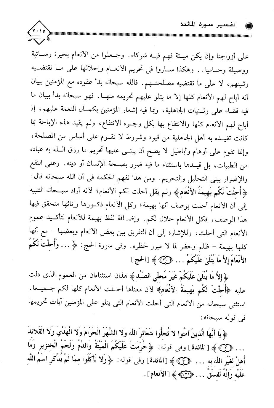 وجعلوا من الأنعام بحيرة وسائبة ووصيلة وحاميا.، وهكذا ساروا في تحريم الأنعام وإحلالها على ما تقتضيه وثنيتهم، لَا على ما تقتضيه مصلحتهم. فالله سبحانه بدأ عقوده مع المؤمنين ببيان أنه أباح لهم الأنعام كلها إلا ما يتلو عليهم تحريمه منها. فهو سبحانه بدأ ببيان ما فيه قضاء على وثنيات الجاهلية، وبما فيه إشعار المؤمنين بكمال النعمة عليهم، إذ أباح لهم الأنعام كلها والانتفاع بها بكل وجوه الانتفاع، ولم يقيد هذه الإباحة بما كانت تقيده به أهل الجاهلية من قيود وشروط لَا تقوم على أساس من المصلحة، وإنما تقوم على أوهام وأباطيل لَا يصح أن يبنى عليها تحريم ما رزق الله به عباده من الطيبات، بل قيدها باستثناء ما فيه ضرر بصحة الإنسان أو دينه. وعلى النفع والإضرار يبنى التحليل والتحريم. ومن هذا نفهم الحكمة في أن الله سبحانه قال: (أُحِلَّتْ لَكُم بَهِيمَةُ الأَنْعَامِ) ولم يقل أحلت لكم الأنعام؛ لأنه أراد سبحانه التنبيه إلى أن الأنعام أحلت بوصف أنها بهيمة، وكل الأنعام ذكورها وإناثها متحقق فيها هذا الوصف، فكل الأنعام حلال لكم. وإضافة لفظ بهيمة للأنعام لتأكيد عموم الأنعام التي أحلت، وللإشارة إلى أن التفريق بين بعض الأنعام وبعضها - مع أنها كلها بهيمة - ظلم وحظر لما لَا مبرر لحظره. وفي سورة الحج: (. . . وَأُحِلَّتْ لَكُمُ الأَنْعَامُ إِلَّا مَا يُتْلَى عَلَيْكُمْ. . .).
