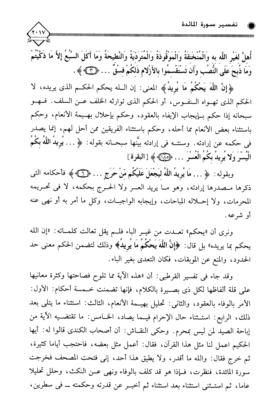 أُهِلَّ لِغَيْرِ اللَّهِ بِهِ وَالْمُنْخَنِقَةُ وَالْمَوْقُوذَةُ وَالْمُتَرَدِّيَةُ وَالنَّطِيحَةُ وَمَا أَكَلَ السَّبُعُ إِلَّا مَا ذَكَّيْتُمْ وَمَا ذُبِحَ عَلَى النُّصُبِ وَأَنْ تَسْتَقْسِمُوا بِالْأَزْلَامِ ذَلِكُمْ فِسْقٌ. . .). (إِنَّ اللَّهَ يَحْكُمُ مَا يُرِيدُ) المعنى: إن الله يحكم الحكم الذي يريده، لا الحكم الذي تهواه النفوس، أو الحكم الذي توارثه الخلف عن السلف. فهو سبحانه إذا حكم بإيجاب الإيفاء بالعقود، وحكم بإحلال بهيمة الأنعام، وحكم باستثناء بعض الأنعام مما أحله، وحكم باستثناء الفريقين ممن أحل لهم، إنما يصدر في حكمه عن إرادته. وسنته في إرادته بينها سبحانه بقوله: (. . . يُرِيدُ اللَّهُ بِكُمُ الْيُسْرَ وَلا يُرِيدُ بِكُمُ الْعُسْرَ. . .).