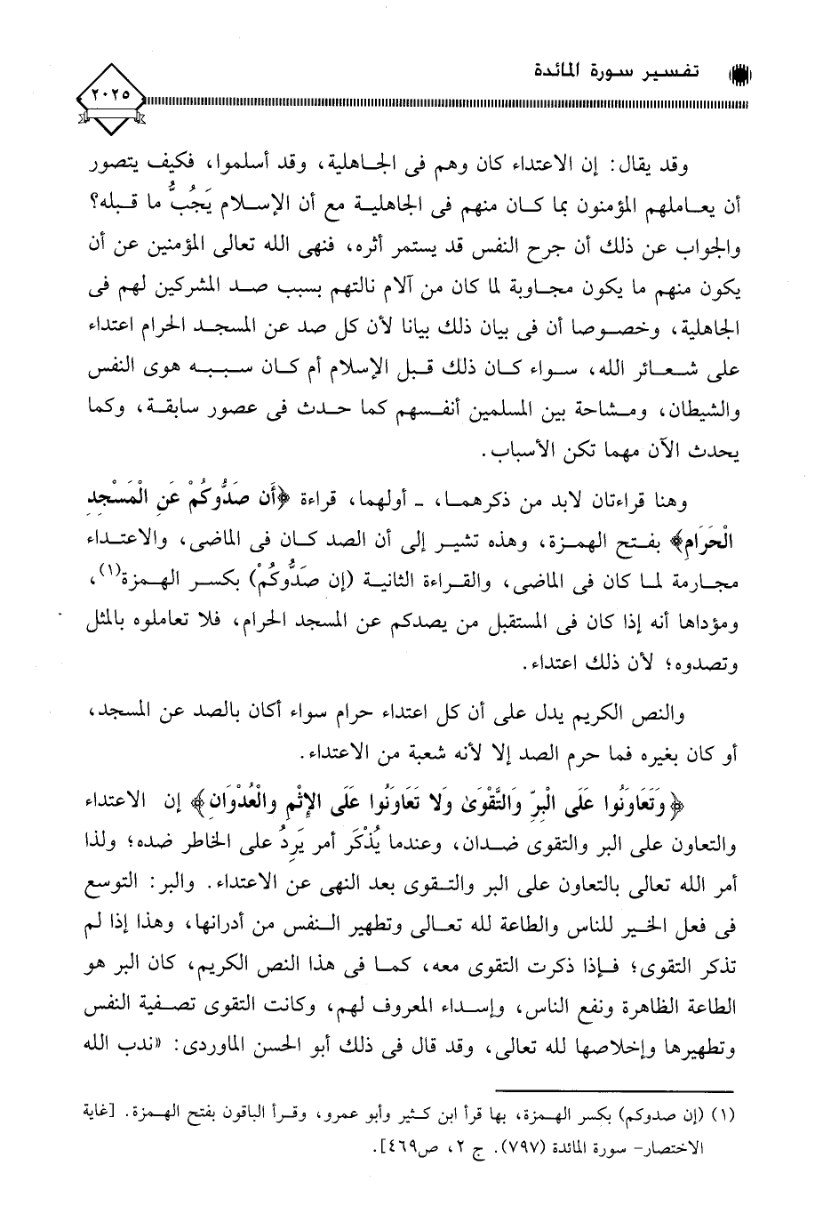 وهنا قراءتان لابد من ذكرهما، - أولهما، قراءة (أَن صَدُّوكُمْ عَنِ الْمَسْجِدِ الْحَرَامِ) بفتح الهمزة، وهذه تشير إلى أن الصد كان في الماضي، والاعتداء مجارمة لما كان في الماضي، والقراءة الثانية (إن صَدُّوكُمْ) بكسر الهمزة (¬1)، ومؤداها أنه إذا كان في المستقبل من يصدكم عن المسجد الحرام، فلا تعاملوه بالمثل وتصدوه؛ لأن ذلك اعتداء.
