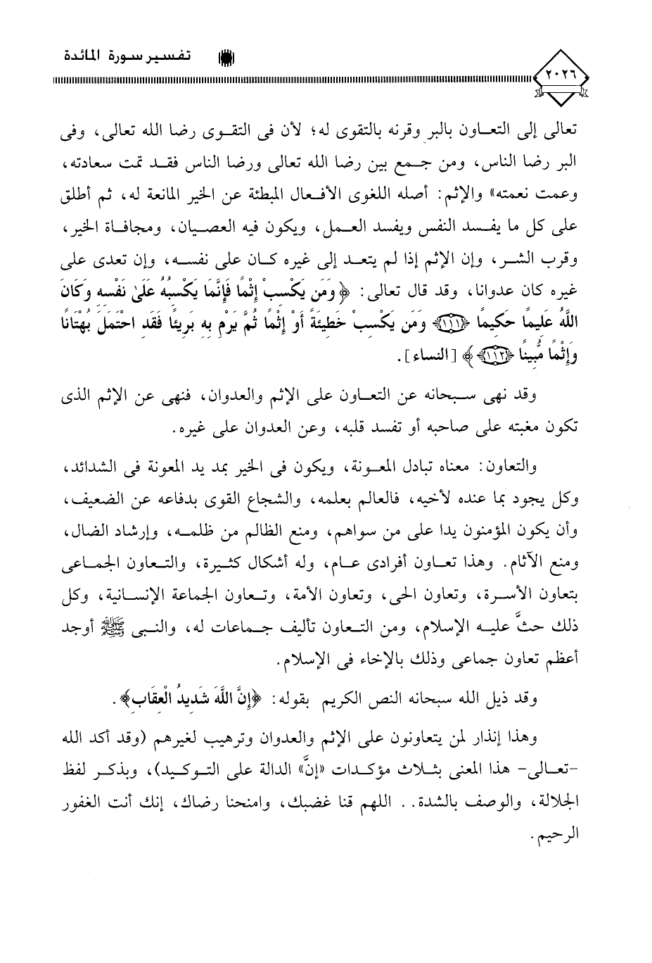 تعالى إلى التعاون بالبر وقرنه بالتقوى له، لأن في التقوى رضا الله تعالى، وفي البر رضا الناس، ومن جمع بين رضا الله تعالى ورضا الناس فقد تمت سعادته، وعمت نعمته " والإثم: أصله اللغوي الأفعال المبطئة عن الخير المانعة له، ثم أطلق على كل ما يفسد النفس ويفسد العمل، ويكون فيه العصيان، ومجافاة الخير، وقرب الشر، وإن الإثم إذا لم يتعد إلى غيره كان على نفسه، وإن تعدى على غيره كان عدوانا، وقد قال تعالى: (وَمَنْ يَكْسِبْ إِثْمًا فَإِنَّمَا يَكْسِبُهُ عَلَى نَفْسِهِ وَكَانَ اللَّهُ عَلِيمًا حَكِيمًا (111) وَمَنْ يَكْسِبْ خَطِيئَةً أَوْ إِثْمًا ثُمَّ يَرْمِ بِهِ بَرِيئًا فَقَدِ احْتَمَلَ بُهْتَانًا وَإِثْمًا مُبِينًا (112).