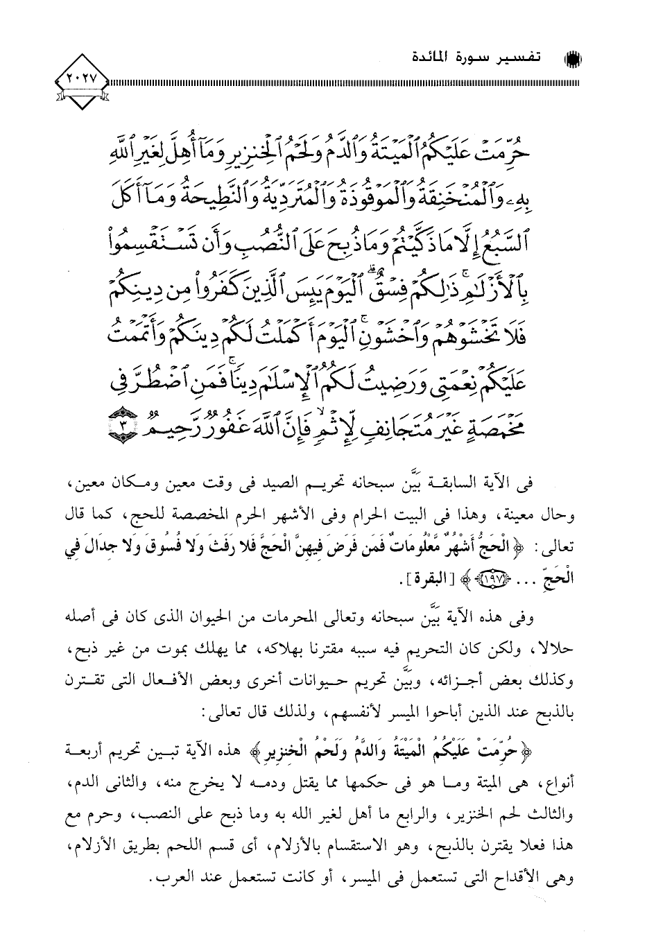 (حُرِّمَتْ عَلَيْكُمُ الْمَيْتَةُ وَالدَّمُ وَلَحْمُ الْخِنْزِيرِ وَمَا أُهِلَّ لِغَيْرِ اللَّهِ بِهِ وَالْمُنْخَنِقَةُ وَالْمَوْقُوذَةُ وَالْمُتَرَدِّيَةُ وَالنَّطِيحَةُ وَمَا أَكَلَ السَّبُعُ إِلَّا مَا ذَكَّيْتُمْ وَمَا ذُبِحَ عَلَى النُّصُبِ وَأَنْ تَسْتَقْسِمُوا بِالْأَزْلَامِ ذَلِكُمْ فِسْقٌ الْيَوْمَ يَئِسَ الَّذِينَ كَفَرُوا مِنْ دِينِكُمْ فَلَا تَخْشَوْهُمْ وَاخْشَوْنِ الْيَوْمَ أَكْمَلْتُ لَكُمْ دِينَكُمْ وَأَتْمَمْتُ عَلَيْكُمْ نِعْمَتِي وَرَضِيتُ لَكُمُ الْإِسْلَامَ دِينًا فَمَنِ اضْطُرَّ فِي مَخْمَصَةٍ غَيْرَ مُتَجَانِفٍ لِإِثْمٍ فَإِنَّ اللَّهَ غَفُورٌ رَحِيمٌ (3)