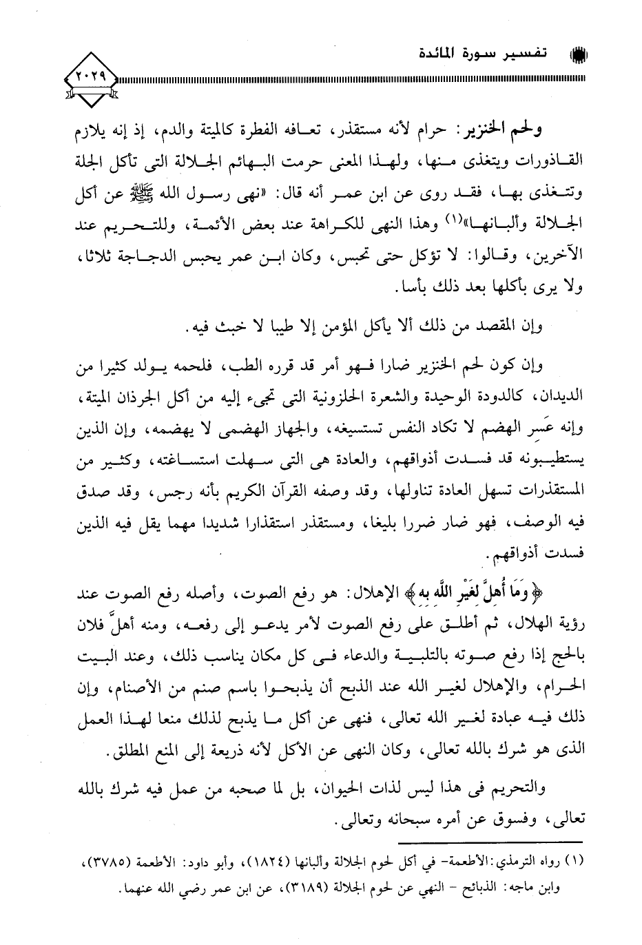 ولحم الخنزير: حرام لأنه مستقذر، تعافه الفطرة كالميتة والدم، إذ إنه يلازم القاذورات ويتغذي منها، ولهذا المعنى حرمت البهائم الجلالة التي تأكل الجلة وتتغذى بها، فقد روي عن ابن عمر أنه قال: " نهى رسول الله - صلى الله عليه وسلم - عن أكل الجلالة وألبانها " (¬1) وهذا النهي للكراهة عند بعض الأئمة، وللتحريم عند الآخرين، وقالوا: لَا تؤكل حتى تحبس، وكان ابن عمر يحبس الدجاجة ثلاثا، ولا يرى بأكلها بعد ذلك بأسا.