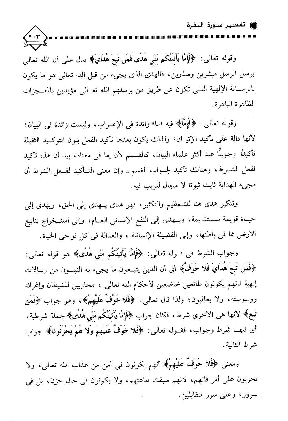 وتنكير هدى هنا للتعظيم والتكثير، فهو هدى يهدي إلى الحق، ويهدي إلى حياة قويمة مستقيمة، ويهدي إلى النفع الإنساني العام، وإلى استخراج ينابيع الأرض مما في باطنها، وإلى الفضيلة الإنسانية، والعدالة في كل نواحي الحياة. وجواب الشرط في قوله تعالى: (فَإِمَّا يَأْتِيَنَّكُم مِّنِّي هُدًى) هو قوله تعالى: (فَمَن تَبِعَ هُدَايَ فَلا خَوْفٌ) أي أن الذين يتبعون ما يجيء به النبيون من رسالات إلهية فإنهم يكونون طائعين خاضعين لأحكام الله تعالى، محاربين للشيطان وإغرائه ووسوسته، ولا يعاقبون؛ ولذا قال تعالى: (فَلا خَوْفٌ عَلَيْهِمْ)، وهو جواب (فَمَن تَبِعَ) لأنها هي الأخرى شرط، فكان جواب (فَإِمَّا يَأتِيَنَّكُم مِّنِّي هُدًى) جملة شرطية، أي فيها شرط وجواب، فقوله تعالى: (فَلا خَوْفٌ عَلَيْهِمْ وَلا هُمْ يَحْزَنُونَ) جواب شرط الثانية.