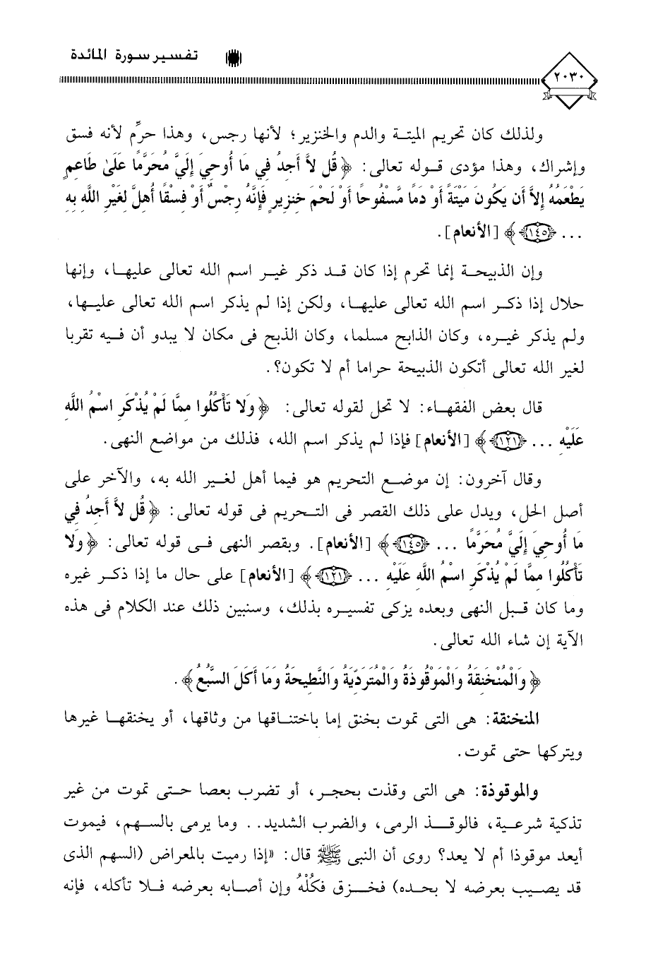 ولذلك كان تحريم الميتة والدم والخنزير، لأنها رجس، وهذا حرِّم لأنه فسق وإشراك، وهذا مؤدى قوله تعالى: (قُل لَا أَجِدُ فِي مَا أُوحِيَ إِلَيَّ مُحَرَّمًا عَلَى طَاعِمٍ يَطْعَمُهُ إِلَّا أَن يَكُونَ مَيْتَةً أَوْ دَمًا مَّسْفُوحًا أَوْ لَحْمَ خِنزِيرٍ فَإِنَّه رِجْسٌ أَوْ فِسْقًا أُهِلَّ لِغَيْرِ اللَّهِ بِهِ).