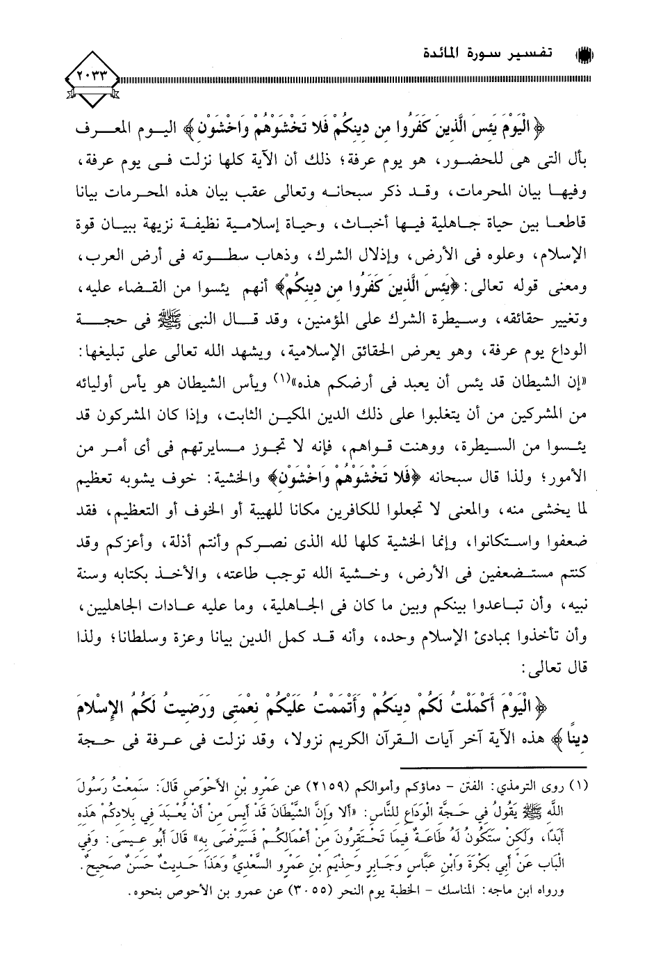 (الْيَوْمَ يَئِسَ الَّذِينَ كَفَرُوا مِنْ دِينِكُمْ فَلَا تَخْشَوْهُمْ وَاخْشَوْنِ) اليوم المعرف بأل التي هي للحضور، هو يوم عرفة؛ ذلك أن الآية كلها نزلت في يوم عرفة، وفيها بيان المحرمات، وقد ذكر سبحانه وتعالى عقب بيان هذه المحرمات بيانا قاطعا بين حياة جاهلية فيها أخباث، وحياة إسلامية نظيفة نزيهة ببيان قوة الإسلام، وعلوه في الأرض، وإذلال الشرك، وذهاب سطوته في أرض العرب، ومعنى قوله تعالى: (يَئِسَ الَّذِينَ كَفَروا مِن دِينِكُمْ) أنهم يئسوا من القضاء عليه، وتغيير حقائقه، وسيطرة الشرك على المؤمنين، وقد قال النبي - صلى الله عليه وسلم - في حجة الوداع يوم عرفة، وهو يعرض الحقائق الإسلامية، ويشهد الله تعالى على تبليغها: " إن الشيطان قد يئس أن يعبد في أرضكم هذه " (¬1) ويأس الشيطان هو يأس أوليائه من المشركين من أن يتغلبوا على ذلك الدِّين المكين الثابت، وإذا كان المشركون قد يئسوا من السيطرة، ووهنت قواهم، فإنه لَا تجوز مسايرتهم في أي أمر من الأمور؛ ولذا قال سبحانه (فَلا تَخْشَوْهُمْ وَاخْشَوْنِ) والخشية: خوف يشوبه تعظيم لما يخشى منه، والمعنى لَا تجعلوا للكافرين مكانا للهيبة أو الخوف أو التعظيم، فقد ضعفوا واستكانوا، وإنما الخشية كلها لله الذي نصركم وأنتم أذلة، وأعزكم وقد كنتم مستضعفين في الأرض، وخشية الله توجب طاعته، والأخذ بكتابه وسنة نبيه، وأن تباعدوا بينكم وبين ما كان في الجاهلية، وما عليه عادات الجاهليين، وأن تأخذوا بمبادئ الإسلام وحده، وأنه قد كمل الدين بيانا وعزة وسلطانا؛ ولذا قال تعالى: