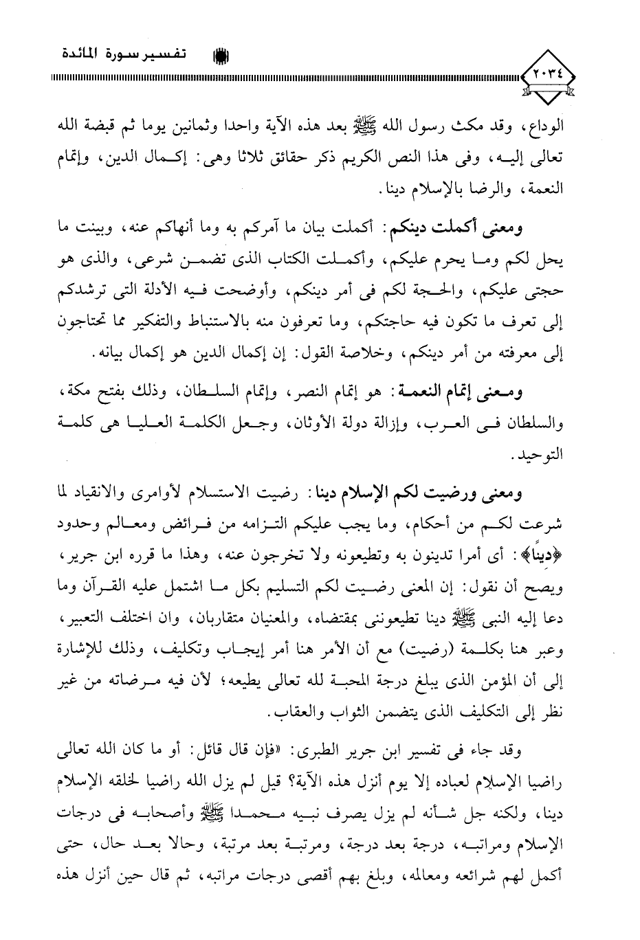الوداع، وقد مكث رسول الله - صلى الله عليه وسلم - بعد هذه الآية واحدا وثمانين يوما ثم قبضهُ اللَّهُ تعالى إليه، وفي هذا النص الكريم ذكر حقائق ثلاثا وهي: إكمال الدين، وإتمام النعمة، والرضا بالإسلام دينا.