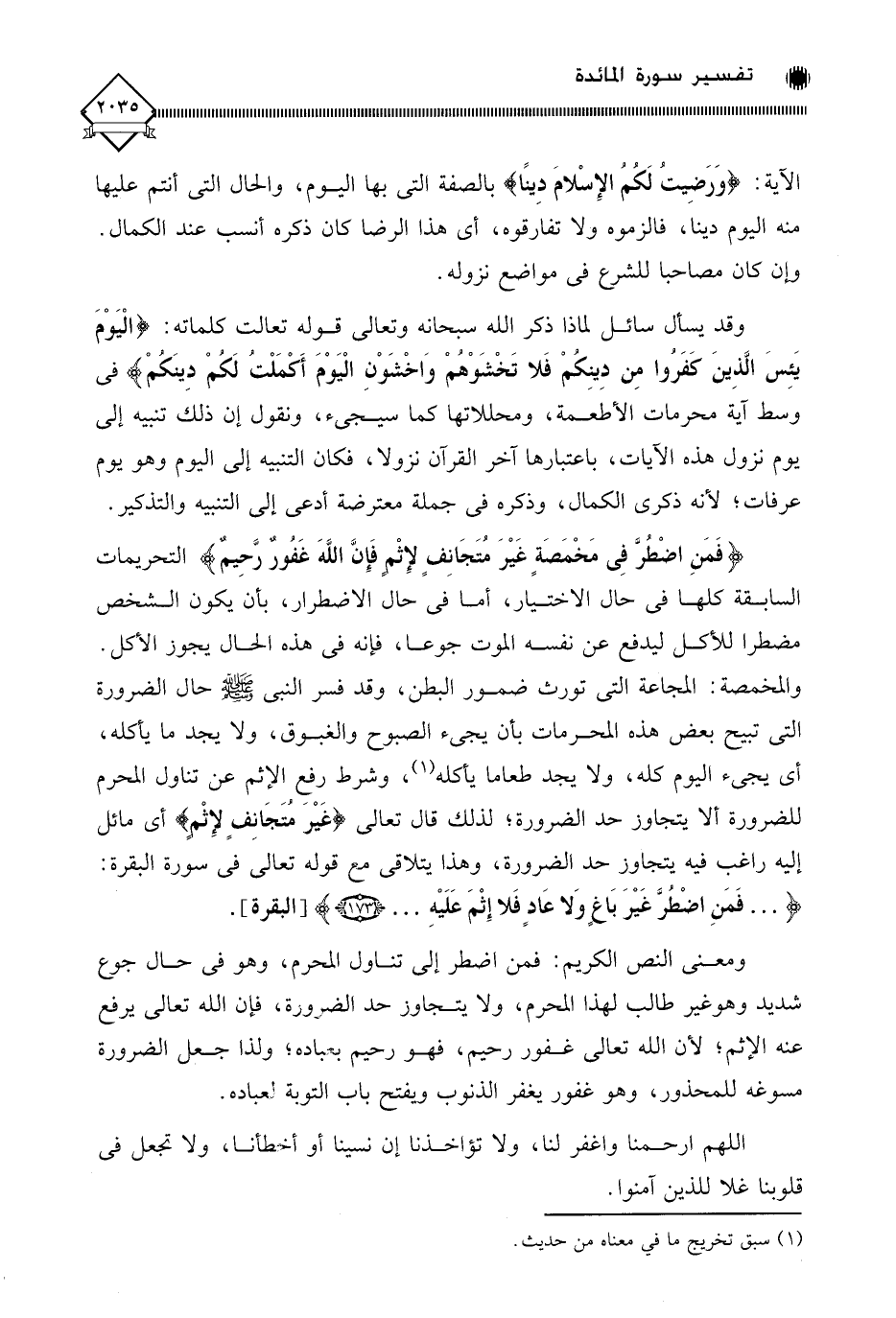 وقد يسأل سائل لماذا ذكر الله سبحانه وتعالى قوله تعالت كلماته: (الْيَوْمَ يَئِسَ الَّذِينَ كَفَرُوا مِن دِينِكُمْ فَلا تَخْشَوْهُمْ وَاخْشَوْنِ الْيَوْمَ أَكْمَلْتُ لَكُمْ دِينَكُمْ) في وسط آية محرمات الأطعمة، ومحللاتها كما سيجيء، ونقول إن ذلك تنبيه إلى يوم نزول هذه الآيات، باعتبارها آخر القرآن نزولا، فكان التنبيه إلى اليوم وهو يوم عرفات؛ لأنه ذكرى الكمال، وذكره في جملة معترضة أدعى إلى التنبيه والتذكير.