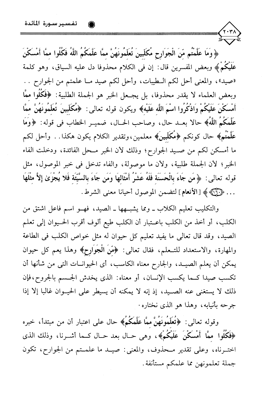 وبعض العلماء لَا يقدر محذوفا، بل يجعل الخبر هو الجملة الطلبية: (فَكُلُوا مِمَّا أَمْسَكْنَ عَلَيْكُمْ وَاذْكُرُوا اسْمَ اللَّهِ عَلَيْهِ) ويكون قوله تعالى: (مُكَلِّبِينَ تُعَلِّمُونَهُنَّ مِمَّا عَلَّمَكُمُ اللَّهُ) حالا بعد حال، وصاحب الحال، ضمير الخطاب في قوله: (وَمَا عَلَّمْتُم) حال كونكم (مُكَلِّبِينَ) معلمين، وتقدير الكلام يكون هكذا. . وأحل لكم ما أمسكن لكم من صيد الجوارح؛ وذلك لأن الخبر محل الفائدة، ودخلت الفاء الخبر؛ لأن الجملة طلبية، ولأن ما موصولة، والفاء تدخل في خبر الموصول، مثل قوله تعالى: (مَن جَاءَ بِالْحَسَنَةِ فَلَهُ عَشْرُ أَمْثَالِهَا وَمَن جَاءَ بِالسَّيِّئَةِ فَلا يُجْزَى إِلَّا مِثْلَهَا)، لتضمن الموصول أحيانا معنى الشرط.