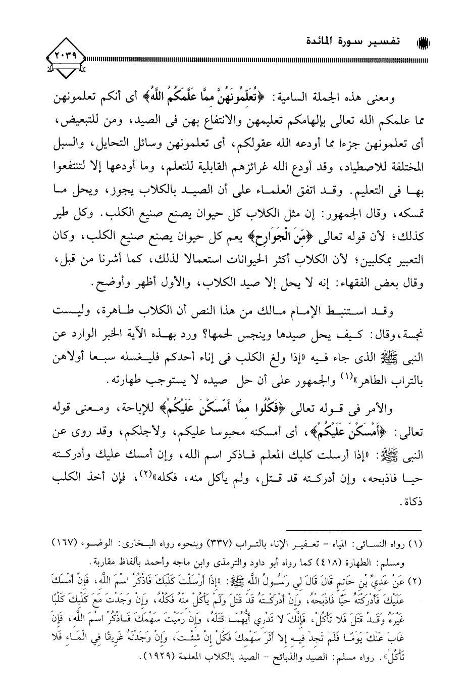 ومعنى هذه الجملة السامية: (تُعَلِّمونَهُنَّ مِمَّا عَلَّمَكُم اللَّه) أي أنكم تعلمونهن مما علمكم الله تعالى بإلهامكم تعليمهن والانتفاع بهن في الصيد، ومن للتبعيض، أي تعلمونهن جزءا مما أودعه الله عقولكم، أي تعلمونهن وسائل التحايل، والسبل المختلفة للاصطياد، وقد أوح الله غرائزهم القابلية للتعلم، وما أودعها إلا لتنتفعوا بها في التعليم. وقد اتفق العلماء على أن الصيد بالكلاب يجوز، ويحل ما تمسكه، وقال الجمهور: إن مثل الكلاب كل حيوان يصنع صنيع الكلب. وكل طير كذلك؛ لأن قوله تعالى (مِّنَ الْجَوَارِحِ) يعم كل حيوان يصنع صنيع الكلب، وكان التعبير بمكلبين؛ لأن الكلاب أكثر الحيوانات استعمالا لذلك، كما أشرنا من قبل، وقال بعض الفقهاء: إنه لَا يحل إلا صيد الكلاب، والأول أظهر وأوضح.