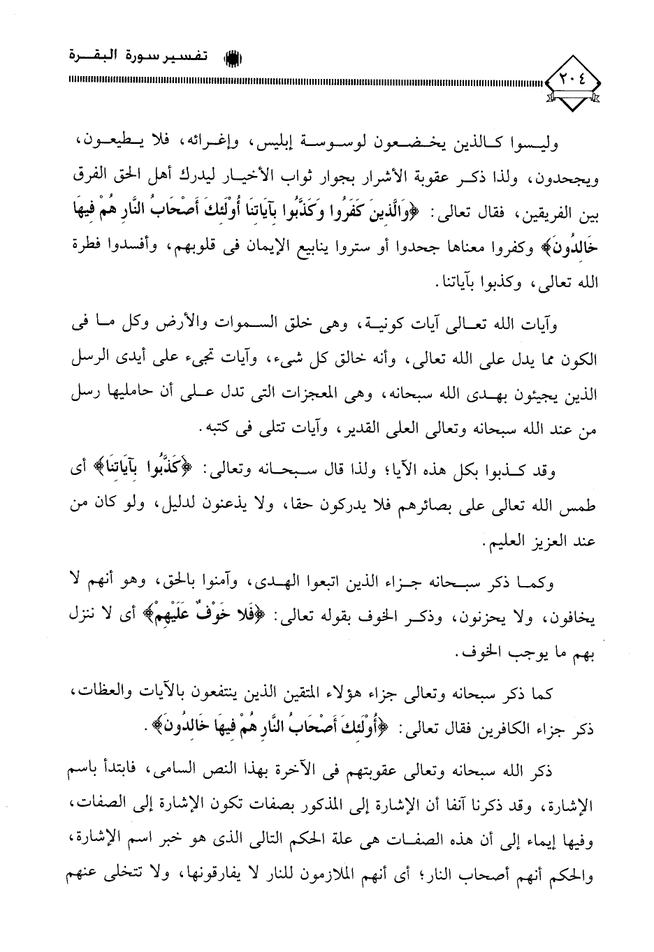 كما ذكر سبحانه وثعالى جزاء هؤلاء المتقين الذين ينتفعون بالآيات والعظات، ذكر جزاء الكافرين فقال تعالى: (أُوْلَئِكَ أَصْحَابُ النَّارِ هُمْ فِيهَا خَالِدُونَ).