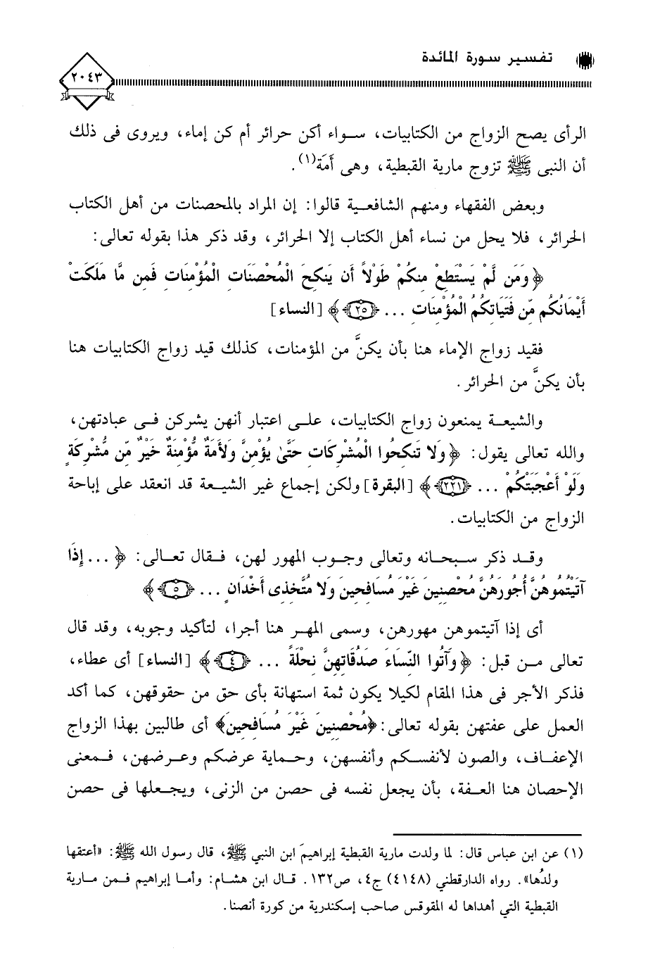 وبعض الفقهاء ومنهم الشافعية قالوا: إن المراد بالمحصنات من أهل الكتاب الحرائر، فلا يحل من نساء أهل الكتاب إلا الحرائر، وقد ذكر هذا بقوله تعالى: