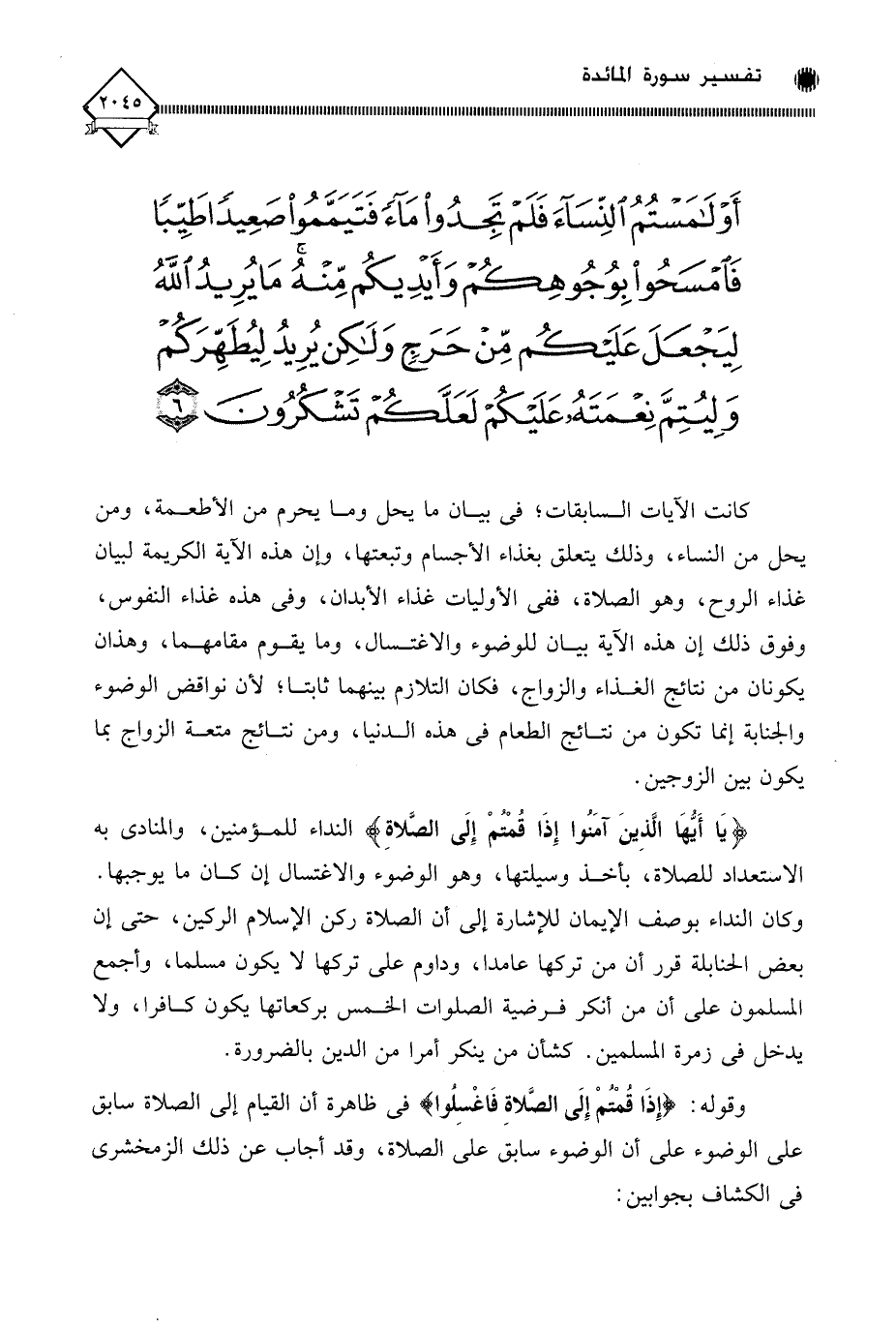 وقوله: (إِذَا قُمْتُمْ إِلَى الصَّلاةِ فَاغْسِلُوا) في ظاهرة أن القيام إلى الصلاة سابق على الوضوء على أن الوضوء سابق على الصلاة، وقد أجاب عن ذلك الزمخشري في الكشاف بجوابين: