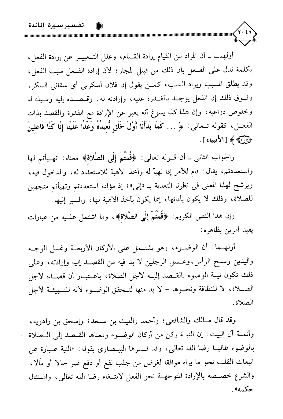 أولهما - أن المراد من القيام إرادة القيام، وعلل التعبير عن إرادة الفعل، بكلمة تدل على الفعل بأن ذلك من قبيل المجاز؛ لأن إرادة الفعل سبب الفعل، وقد يطلق المسبب ويراد السبب، كمن يقول إن فلان أسكرني أي سقاني السكر، وفوق ذلك إن الفعل يوجده بالقدرة عليه، وإرادته له. وقصده إليه وميله له وخلوص دواعيه، وإن هذا كله يسوغ أنه يعبر عن الإرادة مع القدرة والقصد بذات الفعل، كقوله تعالى: (. . . كَمَا بَدَأْنَا أَوَّلَ خَلْقٍ نعِيدُهُ وعْدًا عَلَيْنَا إِنَّا كُنَّا فَاعِلِينَ).