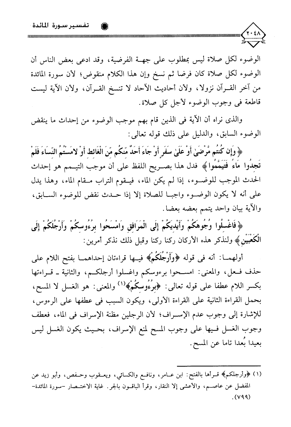 أولهما: أنه في قوله (وَأَرْجُلَكُمْ) فيها قراءتان إحداهما بفتح اللام على حذف فعل، والمعنى: امسحوا برءوسكم واغسلوا أرجلكم، والثانية - قراءتها بكسر اللام عطفا على قوله تعالى: (بِرُءُوسِكُمْ) (¬1) والمعنى: هو الغسل لَا المسح، بحمل القراءة الثانية على القراءة الأولى، ويكون السبب في عطفها على الرءوس، للإشارة إلى وجوب عدم الإسراف، لأن الرجلين مظنة الإسراف في الماء، فعطف وجوب الغسل فيها على وجوب المسح لمنع الإسراف، بحيث يكون الغسل ليس بعيدا بُعدا تاما عن المسح.