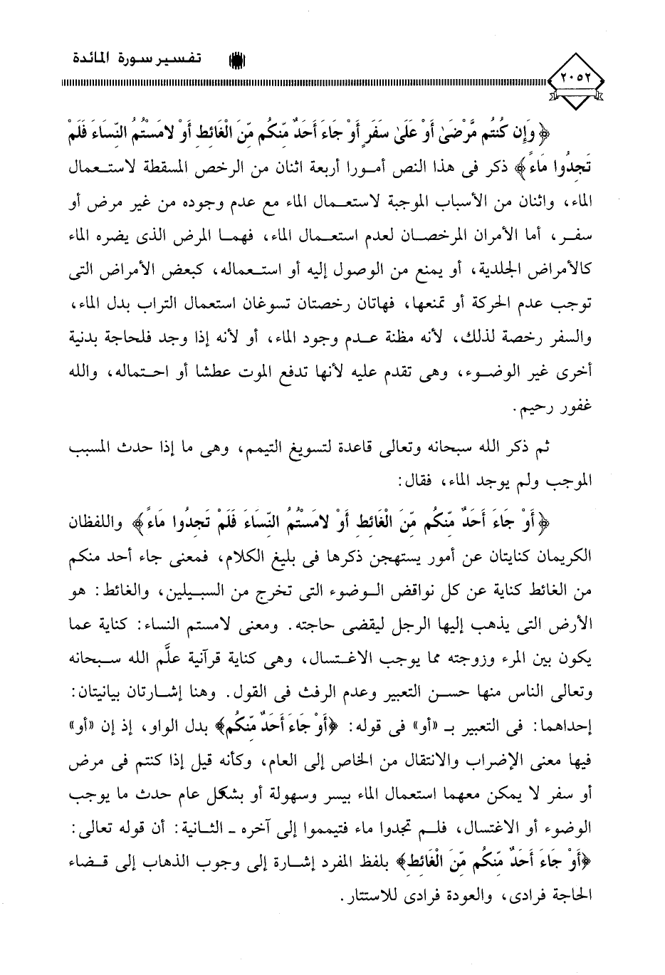 (وَإِنْ كُنْتُمْ مَرْضَى أَوْ عَلَى سَفَرٍ أَوْ جَاءَ أَحَدٌ مِنْكُمْ مِنَ الْغَائِطِ أَوْ لَامَسْتُمُ النِّسَاءَ فَلَمْ تَجِدُوا مَاءً) ذكر في هذا النص أمورا أربعة اثنان من الرخص المسقطة لاستعمال الماء، واثنان من الأسباب الموجبة لاستعمال الماء مع عدم وجوده من غير مرض أو سفر، أما الأمران المرخصان لعدم استعمال الماء، فهما المرض الذي يضره الماء كالأمراض الجلدية، أو يمنع من الوصول إليه أو استعماله، كبعض الأمراض التي توجب عدم الحركة أو تمنعها، فهاتان رخصتان تسوغان استعمال التراب بدل الماء، والسفر رخصة لذلك، لأنه مظنة عدم وجود الماء، أو لأنه إذا وجد فلحاجة بدنية أخرى غير الوضوء، وهي تقدم عليه لأنها تدفع الموت عطشا أو احتماله، والله غفور رحيم.