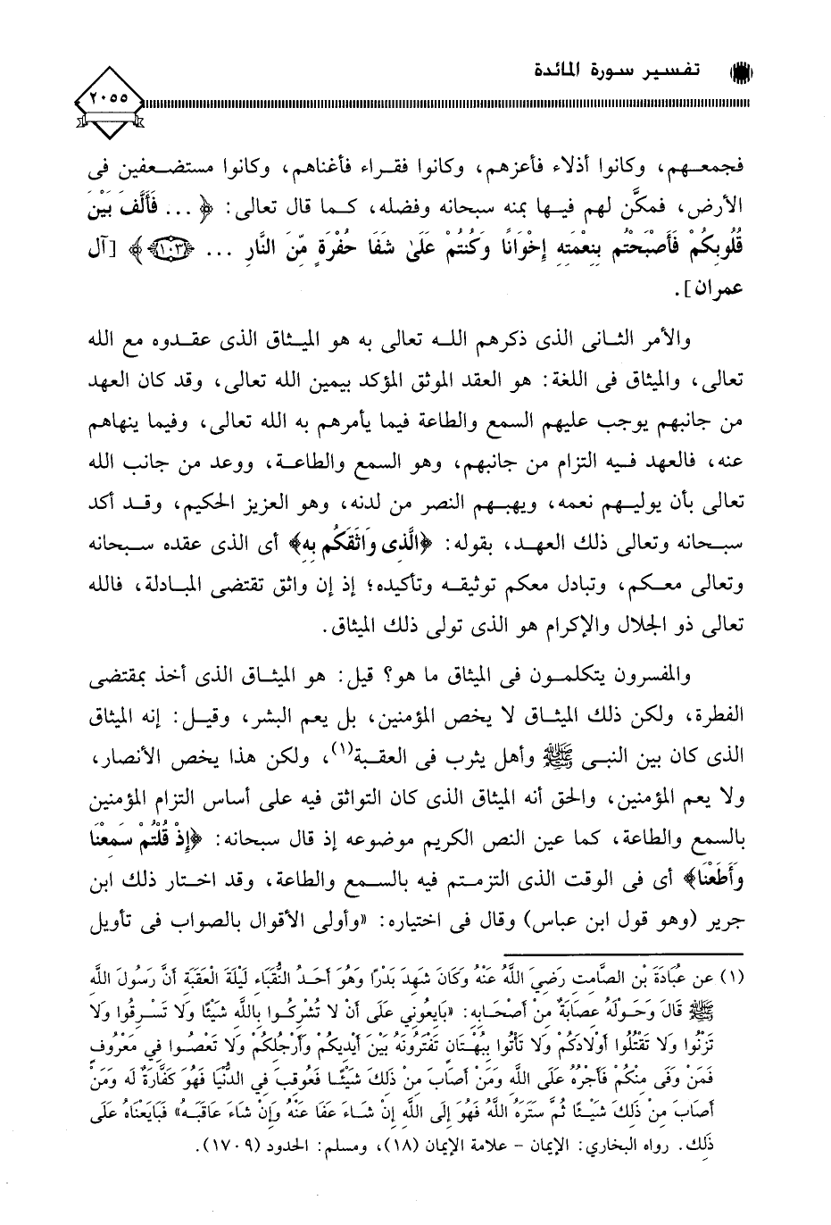 والمفسرون يتكلمون في الميثاق ما هو؛ قيل: هو الميثاق الذي أخذ بمقتضى الفطرة، ولكن ذلك الميثاق لَا يخص المؤمنين، بل يعم البشر، وقيل: إنه الميثاق الذي كان بين النبي - صلى الله عليه وسلم - وأهل يثرب في العقبة (¬1)، ولكن هذا يخص الأنصار، ولا يعم المؤمنين، والحق أنه الميثاق الذي كان التواثق فيه على أساس التزام المؤمنين بالسمع والطاعة، كما عين النص الكريم موضوعه إذ قال سبحانه: (إِذْ قُلْتُمْ سَمِعْنَا وَأَطَعْنَا) أي في الوقت الذي التزمتم فيه بالسمع والطاعة، وقد اختار ذلك ابن جرير (وهو قول ابن عباس) وقال في اختياره: " وأولى الأقوال بالصواب في تأويل