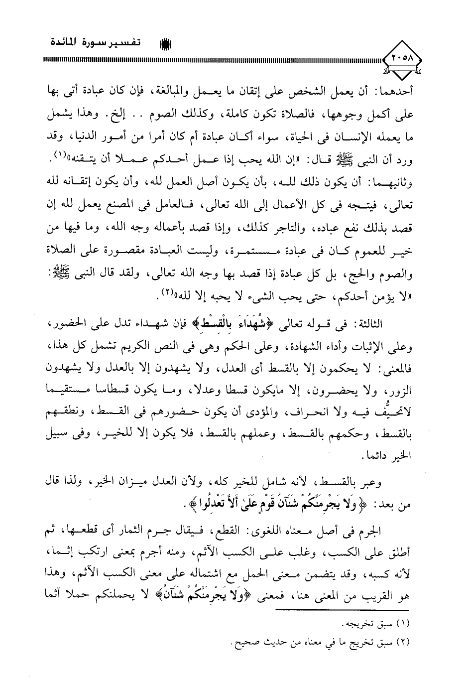 وعبر بالقسط، لأنه شامل للخير كله، ولأن العدل ميزان الخير، ولذا قال من بعد: (وَلا يَجْرِمَنَّكمْ شَنَآنُ قَوْمٍ عَلَى أَلَّا تَعْدِلُوا).