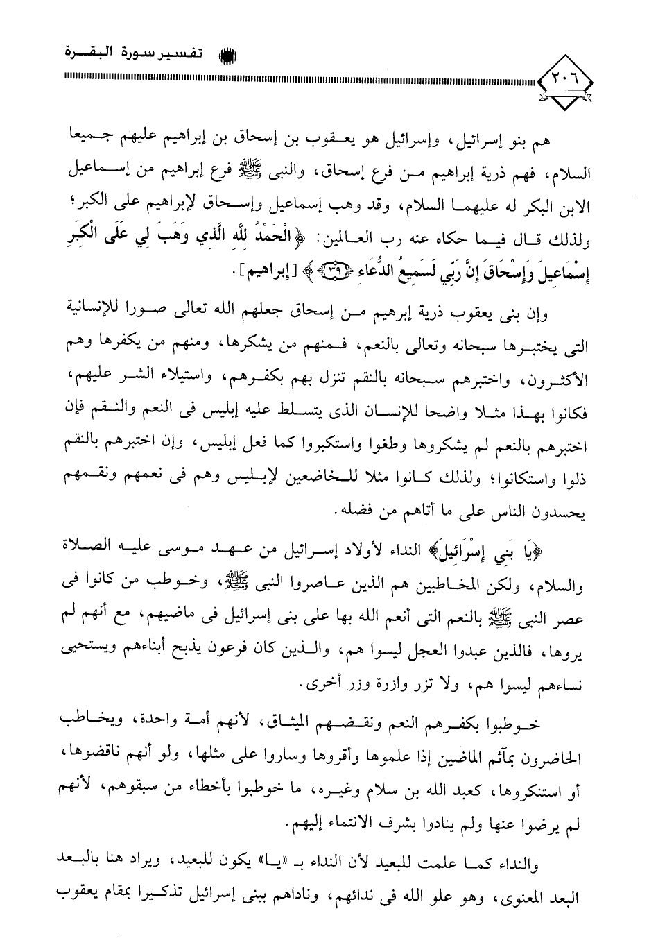 (يَا بَنِي إِسْرَائِيلَ) النداء لأولاد إسرائيل من عهد موسى عليه الصلاة والسلام، ولكن المخاطبين هم الذين عاصروا النبي - صلى الله عليه وسلم -، وخوطب من كانوا في عصر النبي - صلى الله عليه وسلم - بالنعم التي أنعم الله بها على بني إسرائيل في ماضيهم، مع أنهم لم يروها، فالذين عبدوا العجل ليسوا هم، والذين كان فرعون يذبح أبناءهم ويستحيي نساءهم ليسوا هم، وَلَا تَزِرُ وَازِرَةٌ وِزْرَ أُخْرَى.