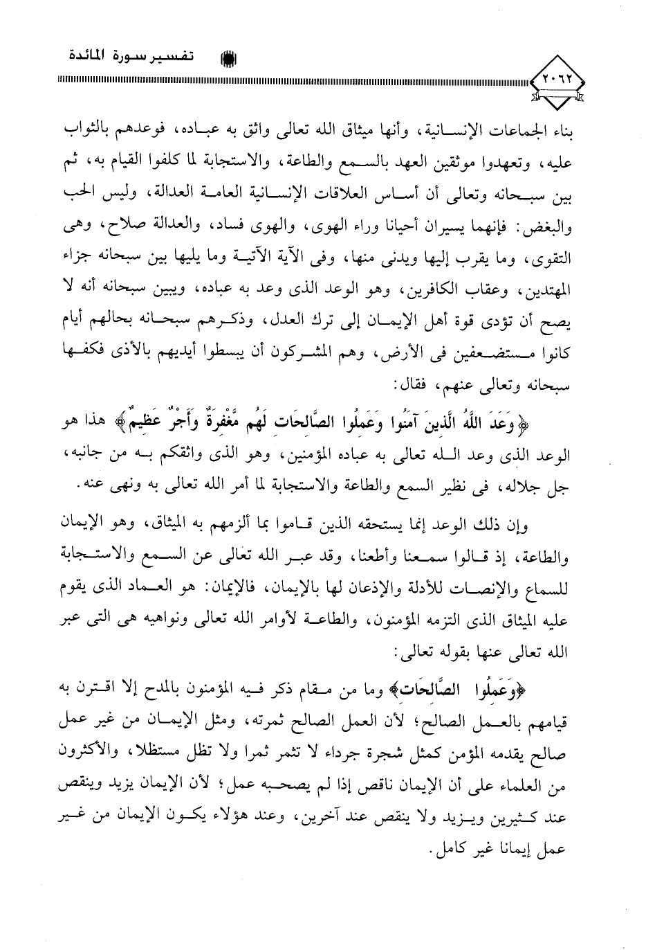 بناء الجماعات الإنسانية، وأنها ميثاق الله تعالى واثق به عباده، فوعدهم بالثواب عليه، وتعهدوا موثقين العهد بالسمع والطاعة، والاستجابة لما كلفوا القيام به، ثم بين سبحانه وتعالى أن أساس العلاقات الإنسانية العامة العدالة، وليس الحب والبغض: فإنهما يسيران أحيانا وراء الهوى، والهوى فساد، والعدالة صلاح، وهي التقوى، وما يقرب إليها ويدنى منها، وفي الآية الآتية وما يليها بين سبحانه جزاء المهتدين، وعقاب الكافرين، وهو الوعد الذي وعد به عباده، ويبين سبحانه أنه لا يصح أن تؤدي قوة أهل الإيمان إلى ترك العدل، وذكرهم سبحانه بحالهم أيام كانوا مستضعفين في الأرض، وهم المشركون أن يبسطوا أيديهم بالأذى فكفها سبحانه وتعالى عنهم، فقال: