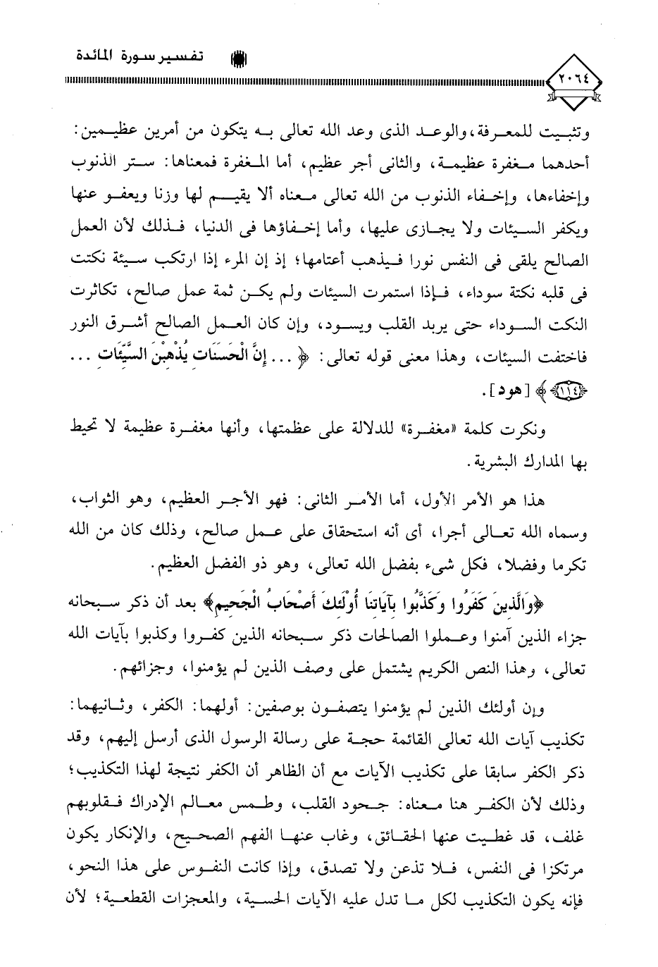 وتثبيت للمعرفة، والوعد الذي وعد الله تعالى به يتكون من أمرين عظيمين: أحدهما مغفرة عظيمة، والثاني أجر عظيم، أما المغفرة فمعناها: ستر الذنوب وإخفاءها، وإخفاء الذنوب من الله تعالى معناه ألا يقيم لها وزنا ويعفو عنها ويكفر السيئات ولا يجازى عليها، وأما إخفاؤها في الدنيا، فذلك لأن العمل الصالح يلقي في النفس نورا فيذهب أعتامها، إذ إن المرء إذا ارتكب سيئة نكتت في قلبه نكتة سوداء، فإذا استمرت السيئات ولم يكن ثمة عمل صالح، تكاثرت النكت السوداء حتى يربد القلب ويسود، وإن كان العمل الصالح أشرق النور فاختفت السيئات، وهذا معنى قوله تعالى: (. . . إِنَّ الْحَسَنَاتِ يُذْهِبْنَ السَّيِّئَاتِ. . .). ونكرت كلمة " مغفرة " للدلالة على عظمتها، وأنها مغفرة عظيمة لَا تحيط بها المدارك البشرية.