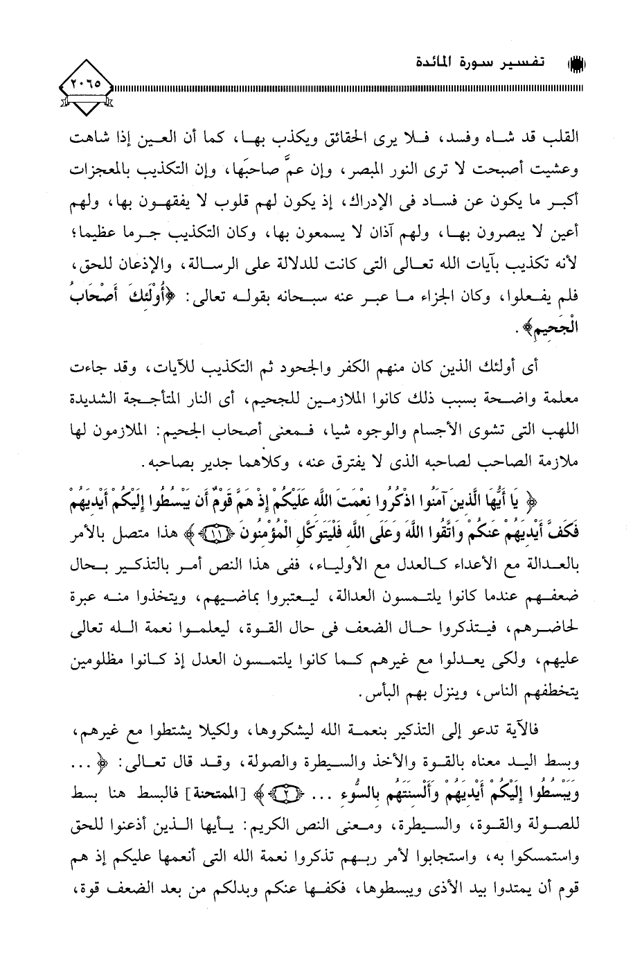 هذا متصل بالأمر بالعدالة مع الأعداء كالعدل مع الأولياء، ففي هذا النص أمر بالتذكير بحال ضعفهم عندما كانوا يلتمسون العدالة، ليعتبروا بماضيهم، ويتخذوا منه عبرة لحاضرهم، فيتذكروا حال الضعف في حال القوة، ليعلموا نعمة الله تعالى عليهم، ولكي يعدلوا مع غيرهم كما كانوا يلتمسون العدل إذ كانوا مظلومين يتخطفهم الناس، وينزل بهم البأس، فالآية تدعو إلى التذكير بنعمة الله ليشكروها، ولكيلا يشتطوا مع غيرهم، وبسط اليد معناه بالقوة والأخذ والسيطرة والصولة، وقد قال تعالى: (. . . وَيَبْسُطُوا إِلَيْكُمْ أَيْدِيَهُمْ وَأَلْسِنَتَهُم بِالسُّوءِ. . .)، فالبسط هنا بسط للصولة والقوة، والسيطرة، ومعنى النص الكريم: يَا أيُّهَا الذين أذعنوا للحق واستمسكوا به، واستجابوا لأمر ربهم تذكروا نعمة الله التي أنعمها عليكم إذ هم قوم أن يمتدوا بيد الأذى ويبسطوها، فكفها عنكم وبدلكم من بعد الضعف قوة،