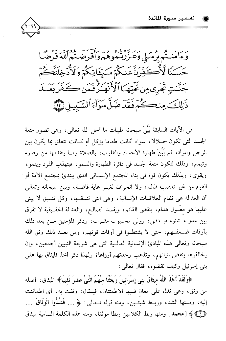 في الآيات السابقة بَيَّنَ سبحانه طيبات ما أحل الله تعالى، وهي تصور متعة الجسد التي تكون حلالا، سواء أكانت طعاما يؤكل أم كانت تتعلق بما يكون بين الرجل والمرأة، ثم بَيَّنَ طهارة الأجساد والقلوب، بالصلاة وما يتقدمها من وضوء وتيمم، وذلك لتكون متعة الجسد في دائرة الطهارة والسمو، فيتهذب الفرد وينمو، ويقوى، وبذلك يكون قوة في بناء المجتمع الإنساني الذي يبتدئ بمجتمع الأمة أو القوم من غير تعصب ظالم، ولا انحراف لغير غاية فاضلة، وبين سبحانه وتعالى أن العدالة هي نظام العلاقات الإنسانية، وهي التي تنسقها، وكل تنسيق لَا يبنى عليها هو مِعْول هدام، ينقض القائم، ويفسد الصالح، والعدالة الحقيقية لَا تفرف بين عدو مشنوء مبغض، وولي محبوب مقرب، وذكر المؤمنين من بعد ذلك بأوقات ضعفهم، حتى لَا يشتطوا في أوقات قوتهم، ومن بعد ذلك وثق الله سبحانه وتعالى هذه المبادئ الإنسانية العالية التي هي شريعة النبيين أجمعين، وإن يخالفوها ينقض بنيانهم، وتذهب وحدتهم أوزاعا؛ ولهذا ذكر أخذ الميثاق بها على بني إسرئيل وكيف نقضوه، فقال تعالى: