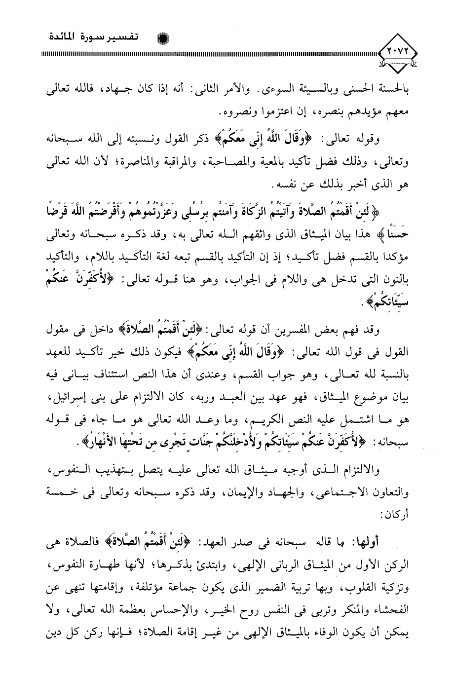 وقد فهم بعض المفسرين أن قوله تعالى: (لَئِنْ أَقَمْتُمُ الصَّلاةَ) داخل في مقول القول في قول الله تعالى: (وَقَالَ اللَّهُ إِنِّى مَعَكُمْ) فيكون ذلك خير تأكيد للعهد بالنسبة لله تعالى، وهو جواب القسم، وعندي أن هذا النص استئناف بياني فيه بيان موضوع الميثاق، فهو عهد بين العبد وربه، كان الالتزام على بني إسرائيل، هو ما اشتمل عليه النص الكريم، وما وعد الله تعالى هو ما جاء في قوله سبحانه: (لأُكَفِّرَنَّ عَنكُمْ سَيِّئَاتِكُمْ وَلأُدْخِلَنَّكُمْ جَنَّاتٍ تَجْرِى مِن تَحْتِهَا الأَنْهَارُ).