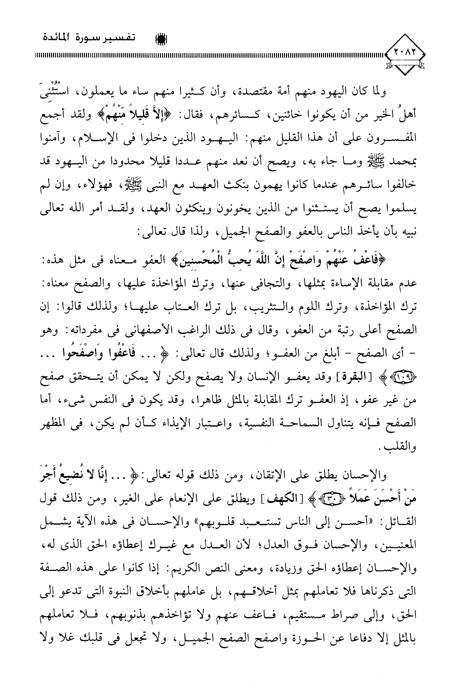والإحسان يطلق على الإتقان، ومن ذلك قوله تعالى: (. . . إِنَّا لَا نُضِيعُ أَجْرَ مَنْ أَحْسَنَ عَمَلًا)، ويطلق على الإنعام على الغير، ومن ذلك قول القائل: " أحسن إلى الناس تستعبد قلوبهم " والإحسان في هذه الآية يشمل المعنيين، والإحسان فوق العدل؛ لأن العدل مع غيرك إعطاؤه الحق الذي له، والإحسان إعطاؤه الحق وزيادة، ومعنى النص الكريم: إذا كانوا على هذه الصفة التي ذكرناها فلا تعاملهم بمثل أخلاقهم، بل عاملهم بأخلاق النبوة التي تدعو إلى الحق، وإلى صراط مستقيم، فاعف عنهم ولا تؤاخذهم بذنوبهم، فلا تعاملهم بالمثل إلا دفاعا عن الحوزة وأصفح الصفح الجميل، ولا تجعل في قلبك غلا