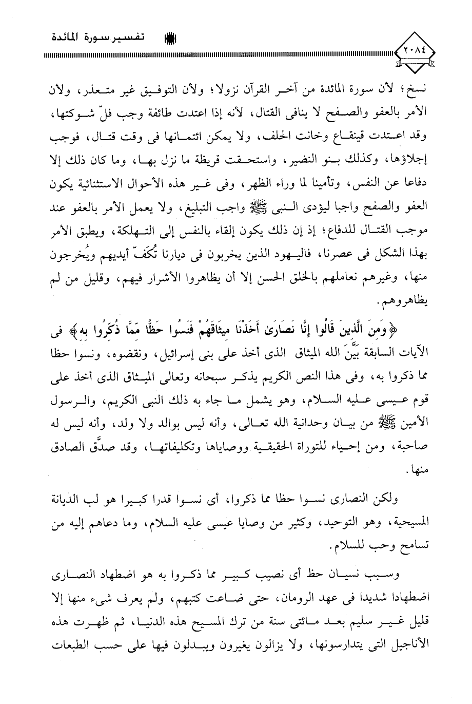 نسخ؛ لأن سورة المائدة من آخر القرآن نزولا؛ ولأن التوفيق غير متعذر، ولأن الأمر بالعفو والصفح لَا ينافي القتال، لأنه إذا اعتدت طائفة وجب فلّ شوكتها، وقد اعتدت قينقاع وخانت الحلف، ولا يمكن ائتمانها في وقت قتال، فوجب إجلاؤها، وكذلك بنو النضير، واستحقت قريظة ما نزل بها، وما كان ذلك إلا دفاعا عن النفس، وتأمينا لما وراء الظهر، وفي غير هذه الأحوال الاستثنائية يكون العفو والصفح واجبا ليؤدي النبي - صلى الله عليه وسلم - واجب التبليغ، ولا يعمل الأمر بالعفو عند موجب القتال للدفاع؛ إذ إن ذلك يكون إلقاء بالنفس إلى التهلكة، ويطبق الأمر بهذا الشكل في عصرنا، فاليهود الذين يخربون في ديارنا تكَفّ أيديهم ويُخرجون منها، وغيرهم نعاملهم بالخلق الحسن إلا أن يظاهروا الأشرار فيهم، وقليل من لم يظاهروهم.