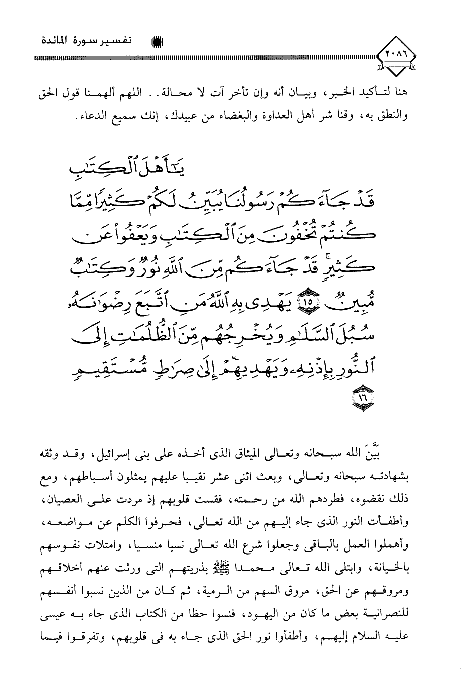 (يَا أَهْلَ الْكِتَابِ قَدْ جَاءَكُمْ رَسُولُنَا يُبَيِّنُ لَكُمْ كَثِيرًا مِمَّا كُنْتُمْ تُخْفُونَ مِنَ الْكِتَابِ وَيَعْفُو عَنْ كَثِيرٍ قَدْ جَاءَكُمْ مِنَ اللَّهِ نُورٌ وَكِتَابٌ مُبِينٌ (15) يَهْدِي بِهِ اللَّهُ مَنِ اتَّبَعَ رِضْوَانَهُ سُبُلَ السَّلَامِ وَيُخْرِجُهُمْ مِنَ الظُّلُمَاتِ إِلَى النُّورِ بِإِذْنِهِ وَيَهْدِيهِمْ إِلَى صِرَاطٍ مُسْتَقِيمٍ (16)