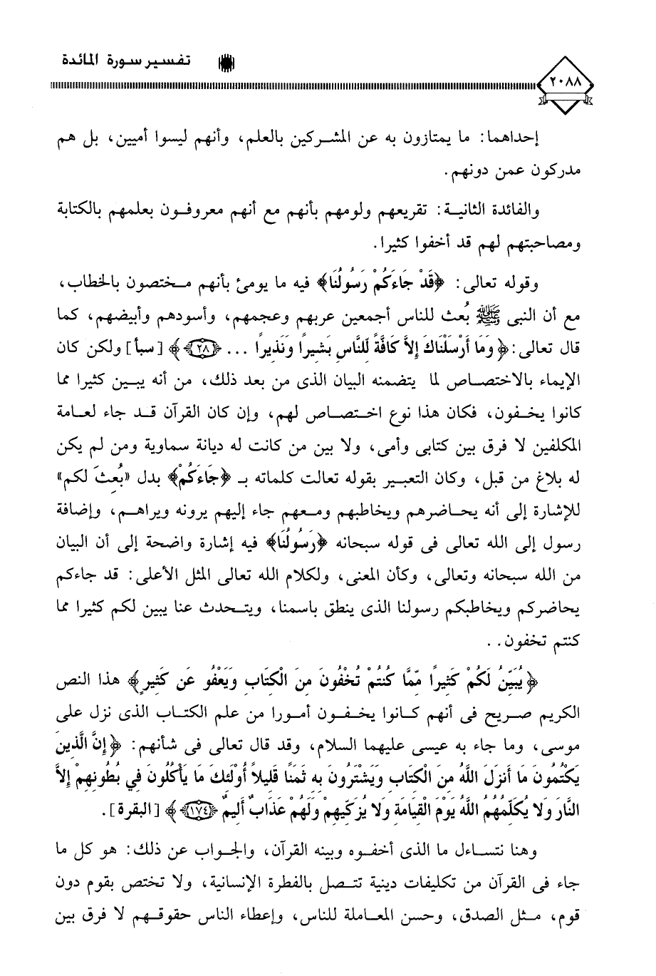 (يُبَيِّنُ لَكُمْ كَثِيرًا مِّمَّا كنتُمْ تُخْفُونَ مِنَ الْكِتَابِ وَيَعْفُو عَن كَثِيرٍ) هذا النص الكريم صريح في أنهم كانوا يخفون أمورا من علم الكتاب الذي نزل على موسى، وما جاء به عيسى عليهما السلام، وقد قال تعالى في شأنهم: (إِنَّ الَّذِينَ يَكْتُمُونَ مَا أَنْزَلَ اللَّهُ مِنَ الْكِتَابِ وَيَشْتَرُونَ بِهِ ثَمَنًا قَلِيلًا أُولَئِكَ مَا يَأْكُلُونَ فِي بُطُونِهِمْ إِلَّا النَّارَ وَلَا يُكَلِّمُهُمُ اللَّهُ يَوْمَ الْقِيَامَةِ وَلَا يُزَكِّيهِمْ وَلَهُمْ عَذَابٌ أَلِيمٌ (174).