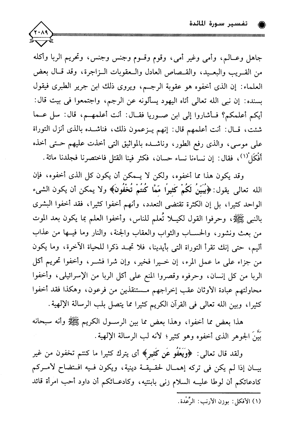 جاهل وعالم، وأمي وغير أمي، وقوم وقوم وجنس وجنس، وتحريم الربا وأكله من القريب والبعيد، والقصاص العادل والعقوبات الزاجرة، وقد قال بعض العلماء: إن الذي أخفوه هو عقوبة الرجم، ويروي ذلك ابن جرير الطبري فيقول بسنده: إن نبي الله تعالى أتاه اليهود يسألونه عن الرجم، واجتمعوا في بيت قال: أيكم أعلمكم؛ فأشاروا إلى ابن صوريا فقال: أنت أعلمهم، قال: سل عما شئت، قال: أنت أعلمهم قال: إنهم يزعمون ذلك، فناشده بالذي أنزل التوراة على موسى، والذي رفع الطور، وناشده بالمواثيق التي أخذت عليهم حتى أخذه أَفْكَلْ (¬1)، فقال: إن نساءنا نساء حسان، فكثر فينا القتل فاختصرنا فجلدنا مائة.