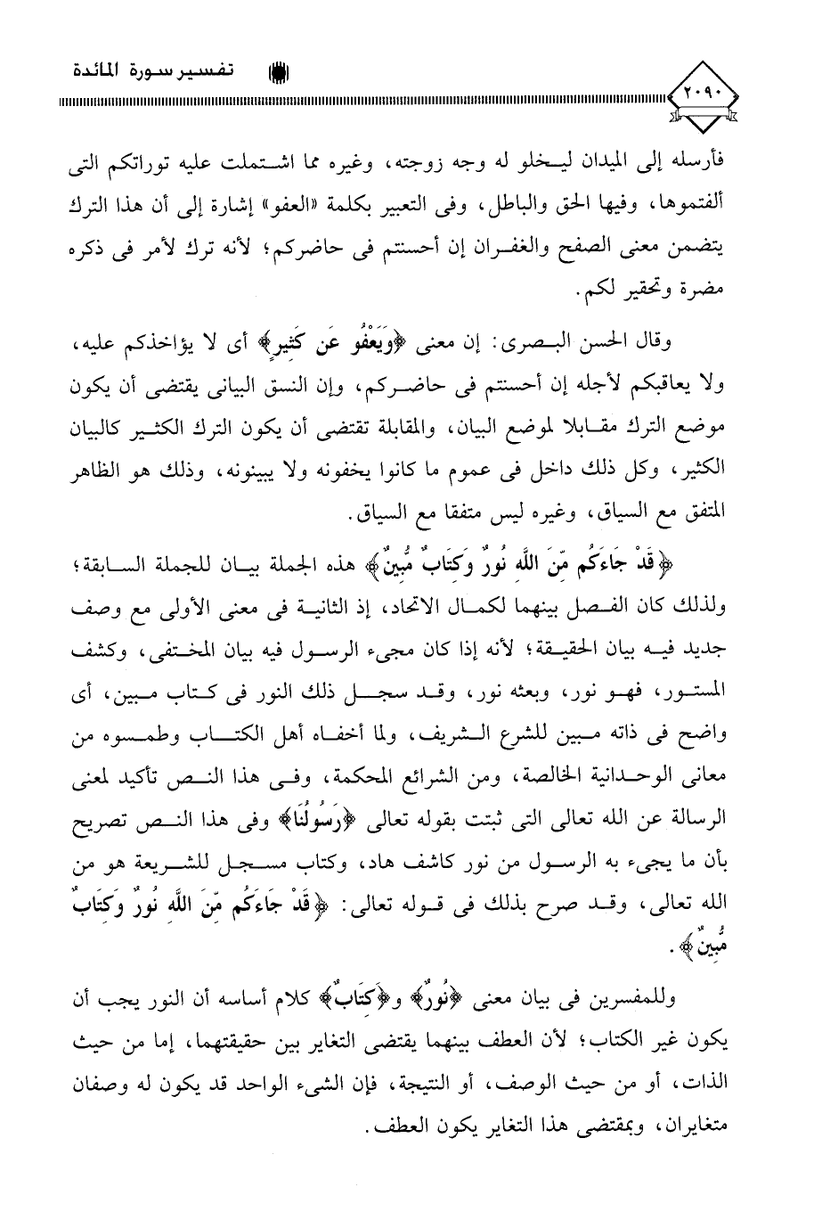 (قَدْ جَاءَكُم مِّنَ اللَّهِ نُورٌ وَكِتَابٌ مبِينٌ) هذه الجملة بيان للجملة السابقة؛ ولذلك كان الفصل بينهما لكمال الاتحاد، إذ الثانية في معنى الأولى مع وصف جديد فيه بيان الحقيقة؛ لأنه إذا كان مجيء الرسول فيه بيان المختفى، وكشف المستور، فهو نور، وبعثه نور، وقد سجل ذلك النور في كتاب مبين، أي واضح في ذاته مبين للشرع الشريف، ولما أخفاه أهل الكتاب وطمسوه من معاني الوحدانية الخالصة، ومن الشرائع المحكمة، وفي هذا النص تأكيد لمعنى الرسالة عن الله تعالى التي ثبتت بقوله تعالى (رَسُولُنَا) وفي هذا النص تصريح بأن ما يجيء به الرسول من نور كاشف هاد، وكتاب مسجل للشريعة هو من الله تعالى، وقد صرح بذلك في قوله تعالى: (قَدْ جَاءَكُم مِّنَ اللَّه نُورٌ وَكتَابٌ مُّبِينٌ).