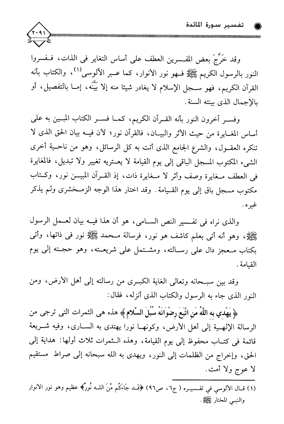 (¬1) قال الألوسي في تفسيره (ج 6، ص 96) (قَد جَاءَكُم مَنَ الله نُورٌ) عظيم وهو نور الأنوار والنبي المختار - صلى الله عليه وسلم -.