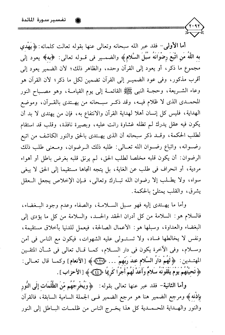 أما الأولى - فقد عبر الله سبحانه وتعالى عنها بقوله تعالت كلماته: (يَهْدِي بِهِ اللَّهُ مَنِ اتَّبَعَ رِضْوَانَهُ سُبُلَ السَّلامِ) والضمير في قوله تعالى: (بِهِ) يعود إلى مجموع ما ذكر، أو يعود إلى القرآن وحده، والظاهر ذلك؛ لأن الضمير يعود إلى أقرب مذكور، وفي عود الضمير إلى القرآن تضمين لكل ما ذكر؛ لأن القرآن هو وعاء الشريعة، وحجة النبي - صلى الله عليه وسلم - القائمة إلى يوم القيامة، وهو مصباح النور المحمدي الذي لَا ظلام فيه، وقد ذكر سبحانه من يهتدي بالقرآن، وموضع الهداية، فليس كل إنسان أهلا لهداية القرآن والانتفاع به، فإن من يهتدي لَا بد أن يكون فيه عقل يدرك لم تظله غشاوة رانت عليه، وبصيرة نافذة، وقلب قد استقام لطلب الحكمة، وقد ذكر سبحانه أن الذي يهتدي بالحق والنور الكاشف من اتبع رضوانه، واتباع رضوان الله تعالى: طلبه ذلك الرضوان، ومعنى طلب ذلك الرضوان: أن يكون قلبه مخلصا لطلب الحق، لم يرنق قلبه بغرض باطل أو أهواء مردية، أو انحراف في طلب عن الغاية، بل يتجه اتجاها مستقيما إلى الحق لَا يبغى سواه، ولا يطلب إلا رضوان الله تبارك وتعالى، فإن الإخلاص يجعل العقل يشرق، والقلب يمتلئ بالحكمة.