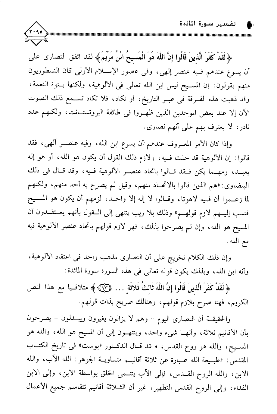 (لَقَدْ كَفَرَ الَّذِينَ قَالُوا إِنَّ اللَّهَ هُوَ الْمَسِيحُ ابْنُ مَرْيَمَ) لقد اتفق النصارى على أن يسوع عندهم فيه عنصر إلهي، وفي عصور الإسلام الأولى كان النسطوريون منهم يقولون: إن المسيح ليس ابن الله تعالى في الألوهية، ولكنها بنوة النعمة، وقد ذهبت هذه الفرقة في عبر التاريخ، أو تكاد، فلا تكاد تسمع ذلك الصوت الآن إلا عند بعض الموحدين الذين ظهروا في طائفة البروتستانت، ولكنهم عدد نادر، لَا يعترف بهم على أنهم نصارى.